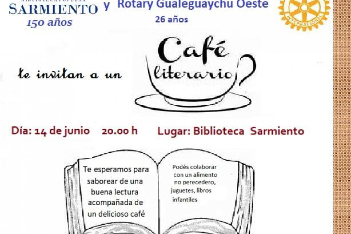 Rotary Gualeguaychú Oeste cumplió 26 años el pasado 3 de junio y para celebrarlo - junto con los 150 años de la Biblioteca Popular Sarmiento - invita a la comunidad al Café literario que se realizará el viernes 14 de junio a las 20 horas en el salón.