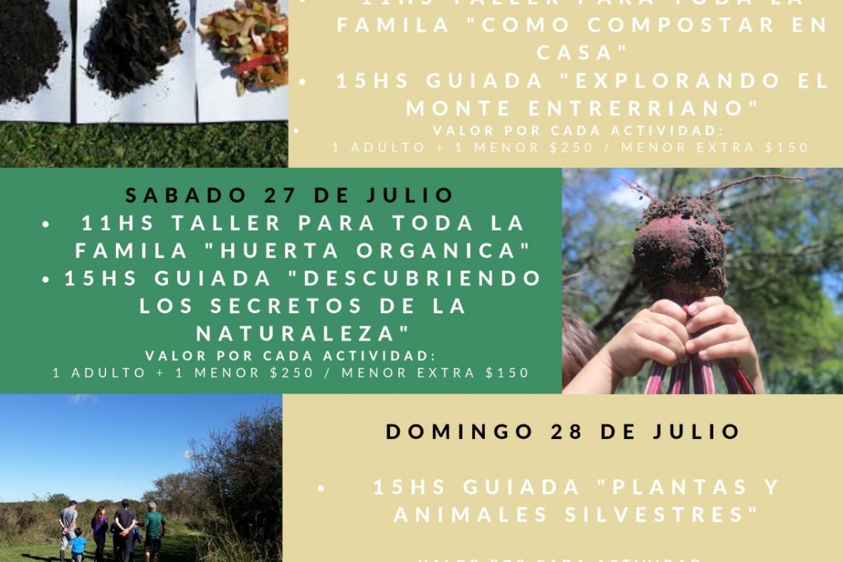 Hay dos alternativas: para los que quieran visitar Senderos del Monte, se abrirá el centro de interpretación de 10 a 18hs. Y para los que quieran participar de actividades programadas los días jueves 25, viernes 26 y sábado 27 de Julio. Estas van desde recorridos para explorar el monte entrerriano o descubrir plantas y animales silvestres, hasta huerta orgánica o compostaje en casa.