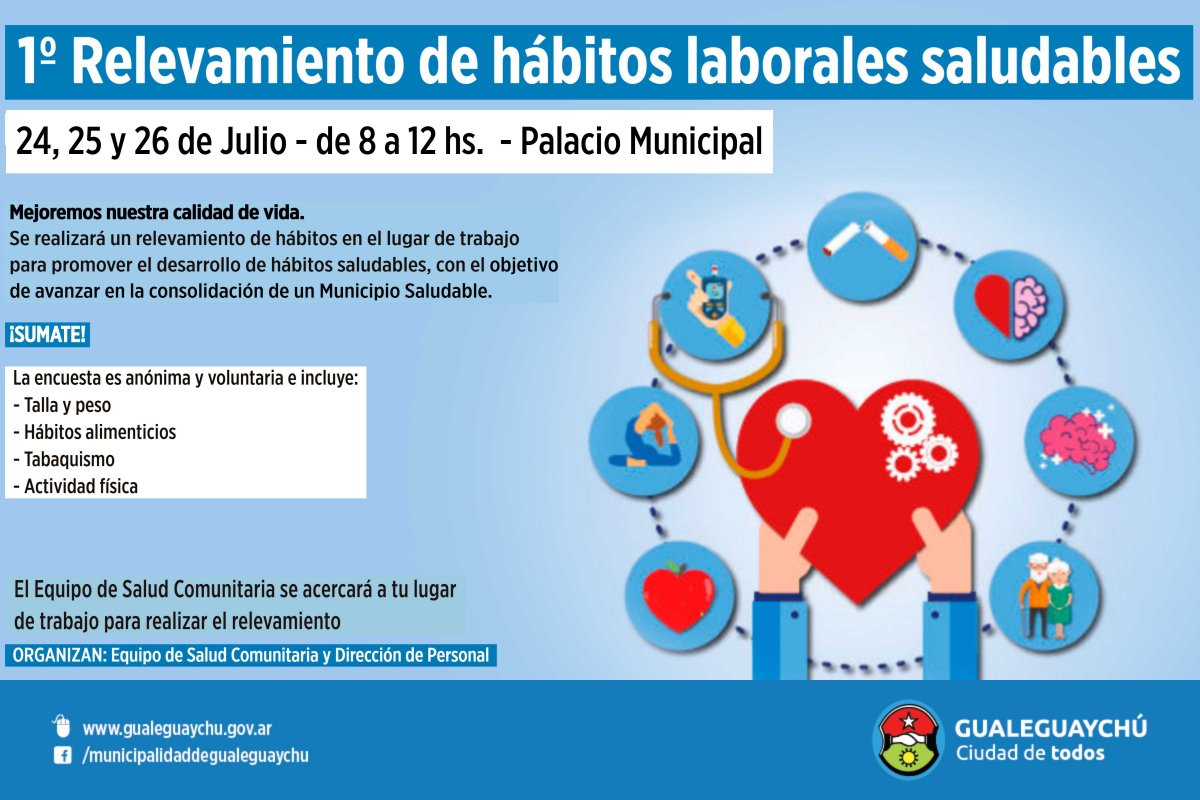 En el marco de la distinción obtenida por Gualeguaychú como Municipio Saludable se llevará adelante esta iniciativa coordinada por el área de Promoción y Equidad para la Salud en conjuto con el equipo de Salud Comunitaria y la dirección de Personal para realizar un relevamiento al personal municipal sobre hábitos alimentarios, realización de actividad física y consumo de tabaco para una posterior promoción de hábitos saludables en el ámbito laboral.