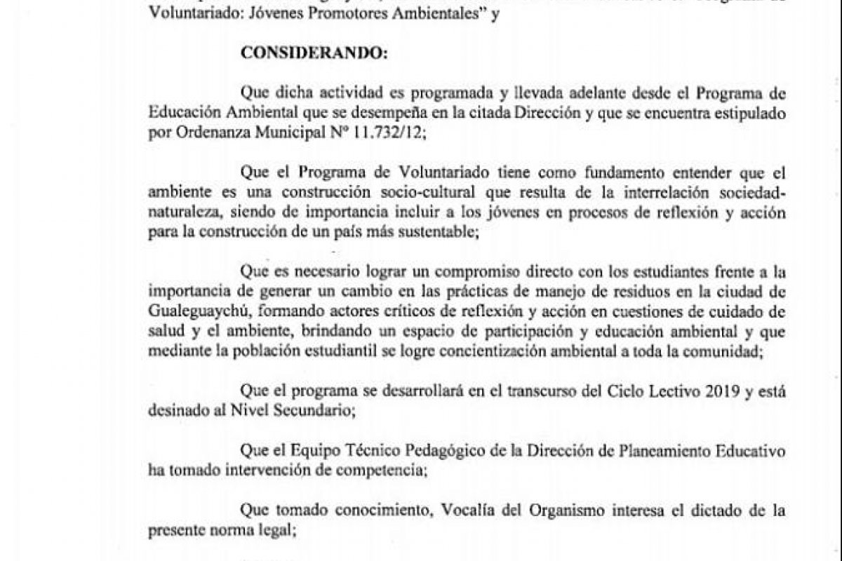 Por resolución 3000 del 5 de julio pasado, el Consejo General de Educación (CGE) de la provincia de Entre Ríos declaró de interés educativo el Programa de Voluntariado Jóvenes Promotores Ambientales que se lleva a cabo este año en la ciudad.