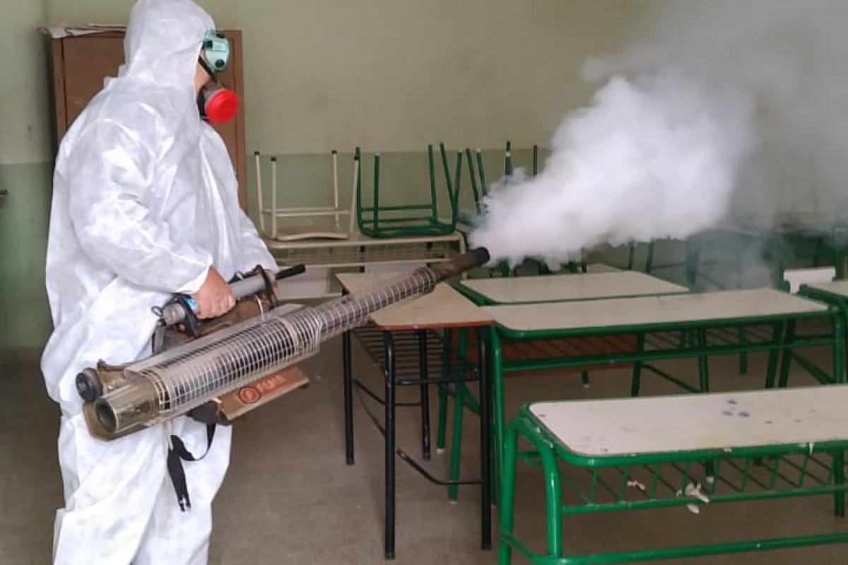 El responsable del el área de Veterinaria, Medico Veterinario Juan Pablo Sack detalló que "se estableció y coordinó con la dirección departamental de Escuelas, un cronograma de trabajo de desinfección de ambientes en las escuelas, luego del acto eleccionario. La misma se llevo adelante, con una aplicación por aspersión con desinfectante cuyo principio activo es amonio cuaternario".