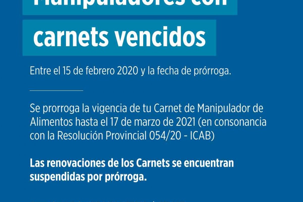 Se recuerda además, que las Renovaciones se encuentran suspendidas y los vencimientos prorrogados; por lo cual a los Manipuladores que poseen su Carnet vencido después del 15 de febrero de 2020 se les informa que se prorrogó su vencimiento según la Resolución 054/2020 ICAB, hasta marzo de 2021.