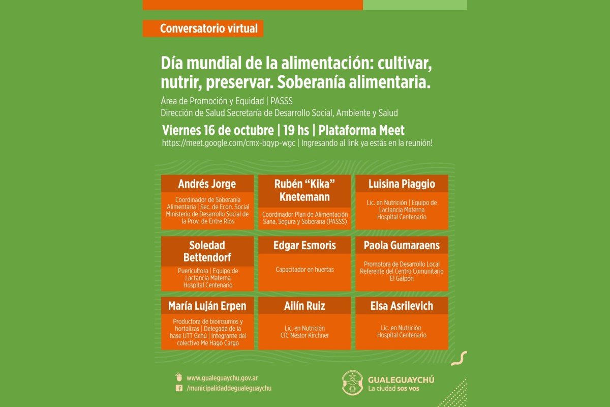 Desde el área de Promoción y Equidad y la dirección de Salud se realizará este viernes 16 de octubre a las 19 hs. un conversatorio virtual en el que se abordarán temas relacionados a la soberanía alimentaria y la producción agroecológica de alimentos sanos.