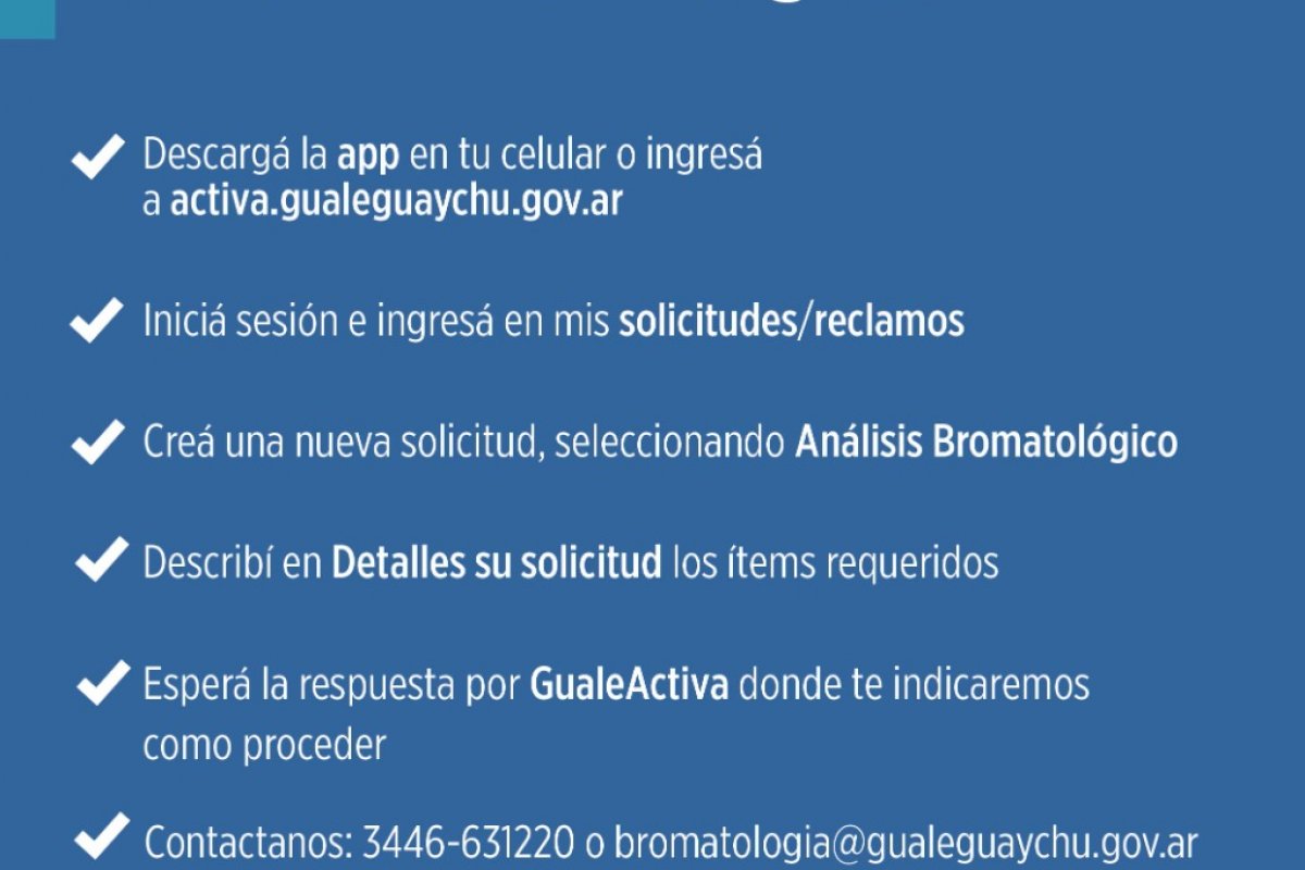 Por consultas: a los teléfonos (03446) 43-7037 / 15631220 o bromatologia@gualeguaychu.gov.ar