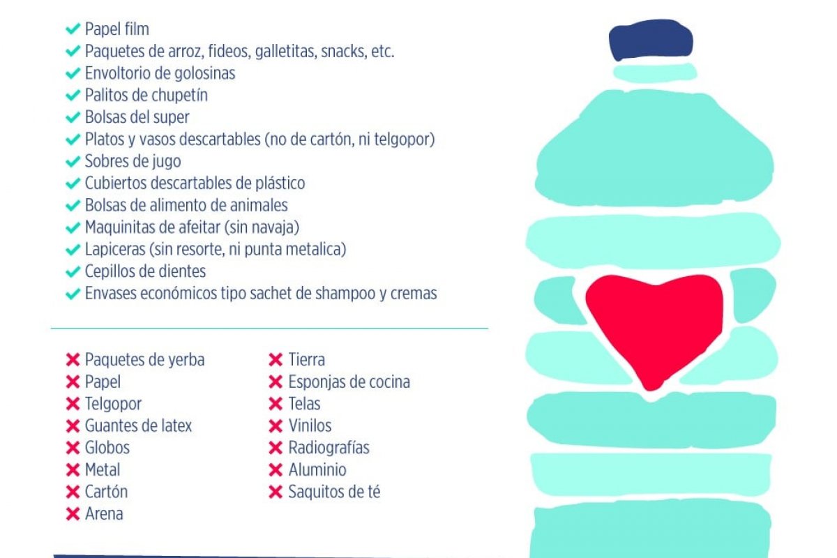 ¿Con qué llenar una ECOBOTELLA? bolsas de polietileno, paquetes de alimentos, snacks, envoltorios de golosinas, mezcladores de café, palitos de chupetín, platos y vasos descartables, bolsas de alimento de animales, maquinitas de afeitar (sin navaja), cepillo de dientes, papel film, etc.