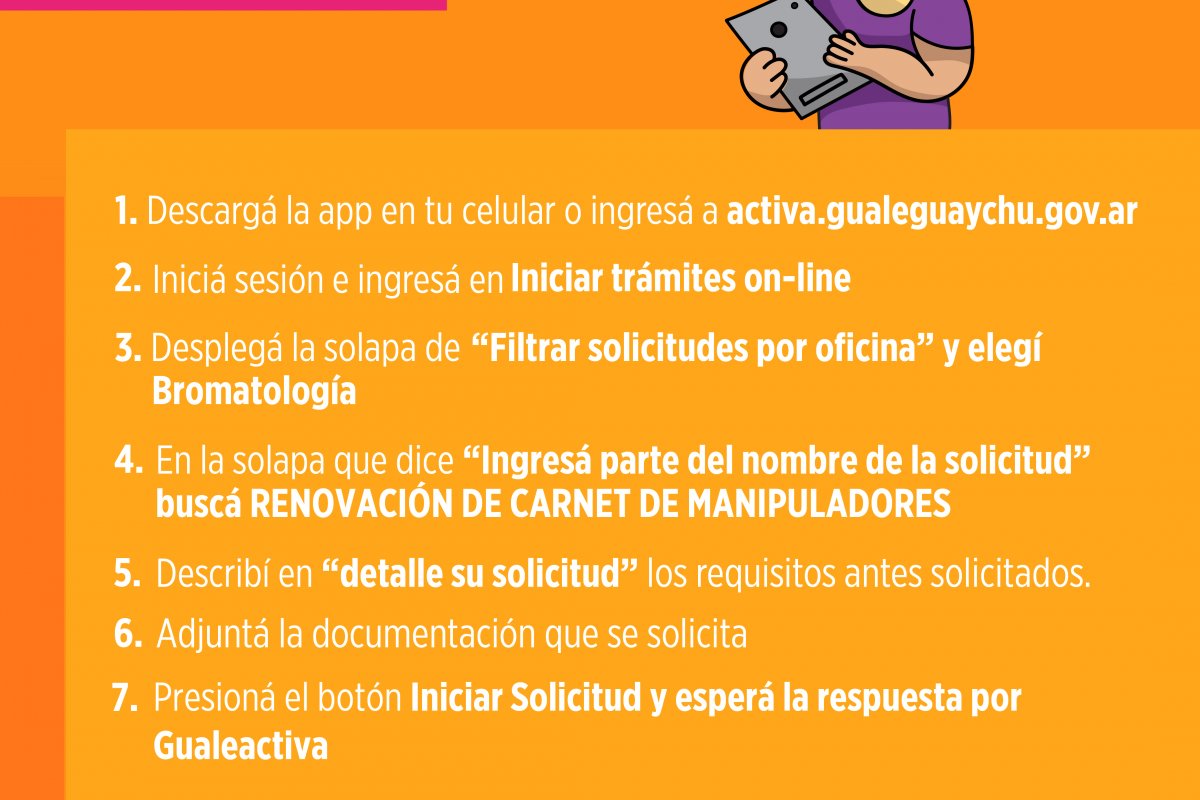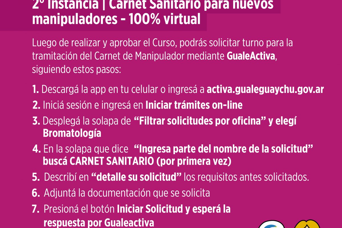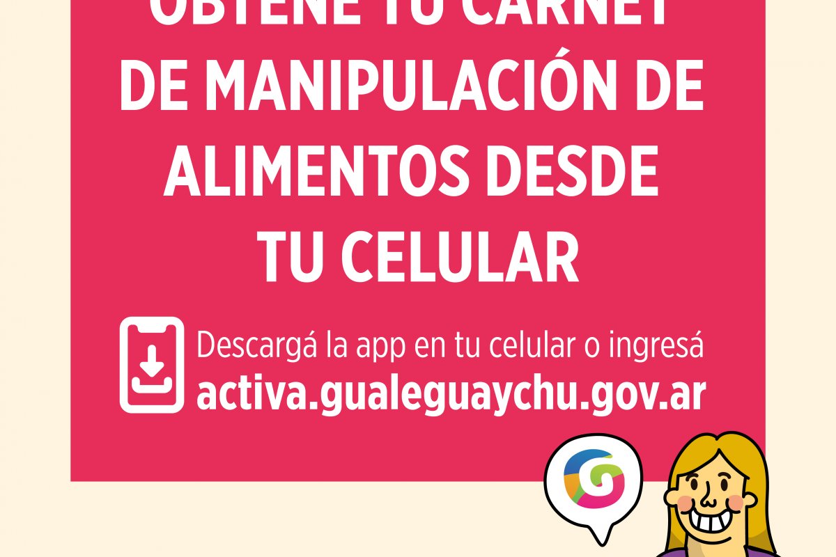 Recordamos que en el contexto de la pandemia a partir del mes de agosto del 2020, y a fin de atender la necesidad de que los nuevos manipuladores puedan realizar el Curso de Manipulación Segura de Alimentes y posteriormente tramiten su Carnet Sanitario por primera vez; se puso a disposición de los usuarios nuevas herramientas desde la Plataforma Gualeactiva, lo que sumado al dictado on-line del Curso, garantizó que las personas puedan acceder a la capacitación y al Carnet de manera remota.