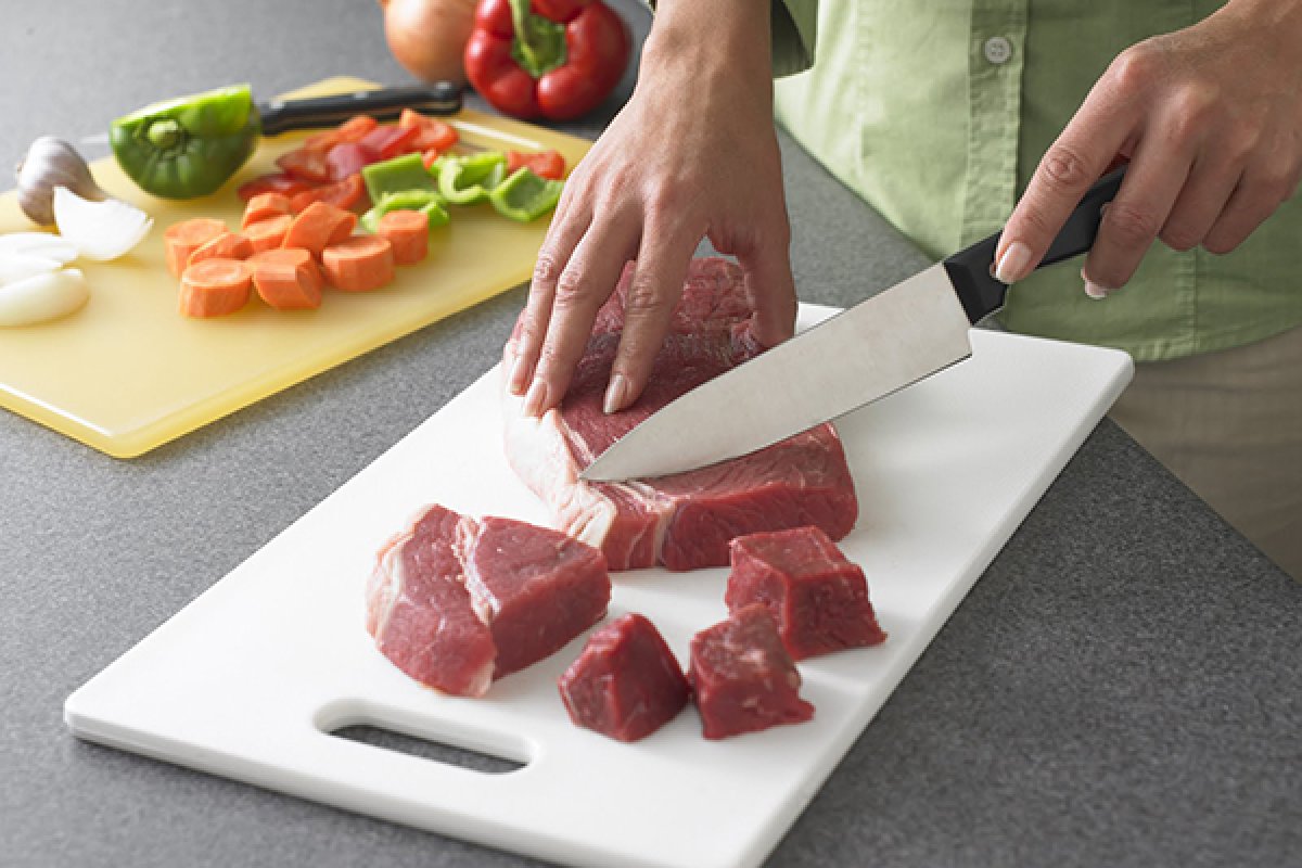 Use equipos y utensilios (cuchillas, tablas de cortar, etc.) diferentes para alimentos crudos (como carmes, pollos), para frutas y verduras, y para alimentos cocidos. Entre un uso y el siguiente, lave, desinfecte y enjuague todos los utensilios.