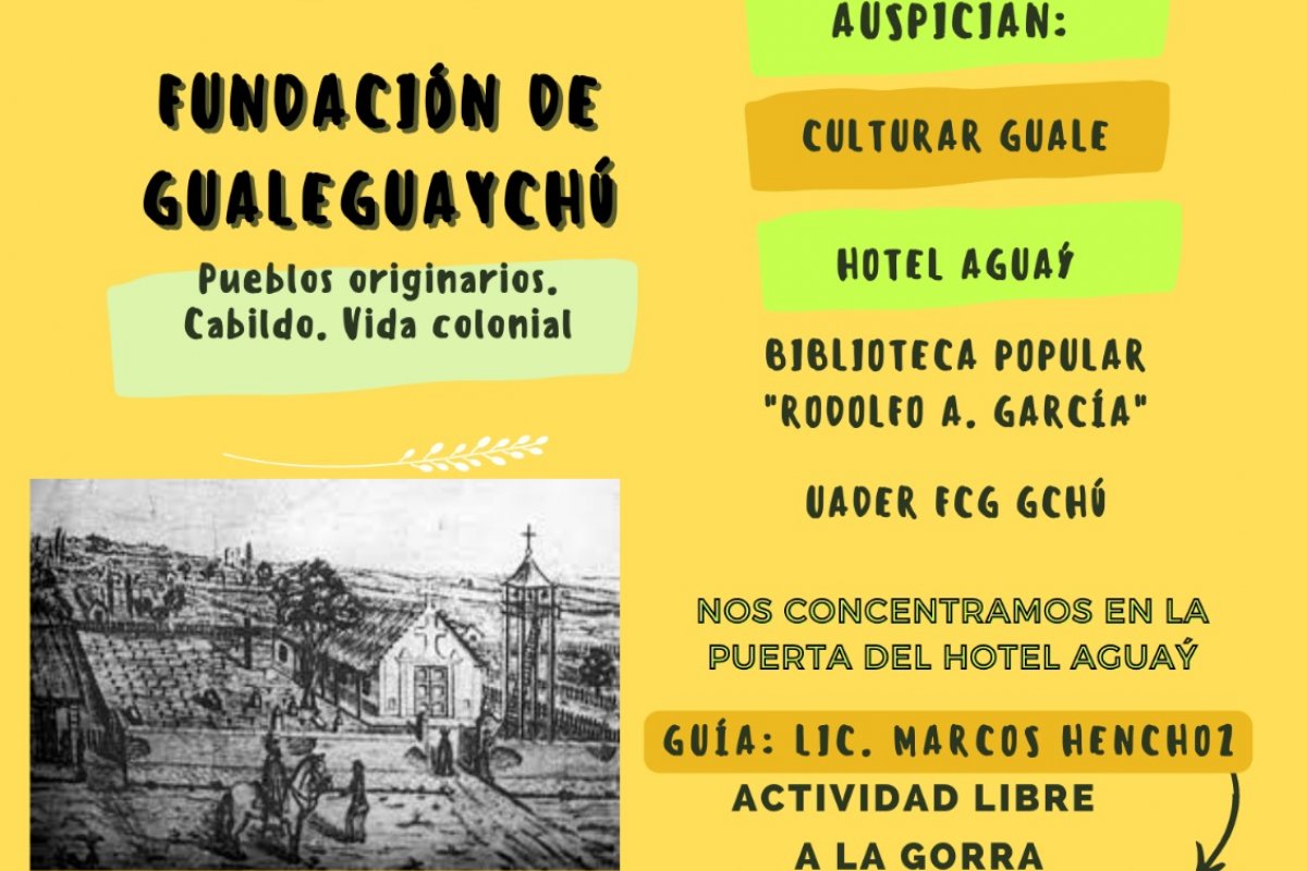 En el marco del programa Culturar Guale que lleva adelante la dirección de Cultura de la Municipalidad de Gualeguaychú, se llevará adelante una charla sobre la "Fundación de Gualeguaychú", con la metodología de caminata peripatética, es decir, que la charla se realizará caminando por un tramo de la Costanera, hablando sobre los pueblos originarios, Cabildo y vida colonial.