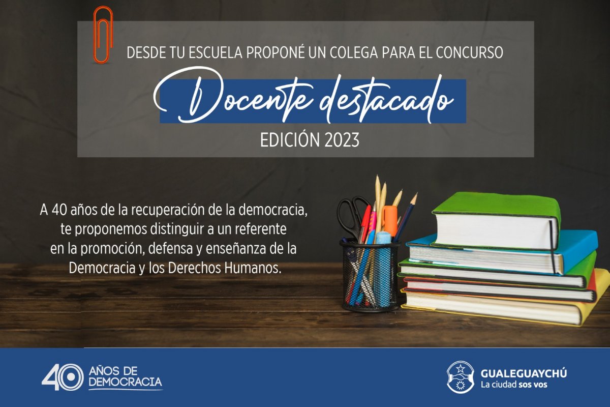 La Municipalidad de Gualeguaychú, en vinculación con la dirección Departamental de Escuelas de Gualeguaychú, con la intervención de la dirección de Educación Popular, y dando cumplimiento al Decreto N° 3020/2022, lanza el concurso "Docente destacado de la ciudad de Gualeguaychú", edición 2023, en el marco de la promoción, defensa y enseñanza de los derechos humanos y la democracia.