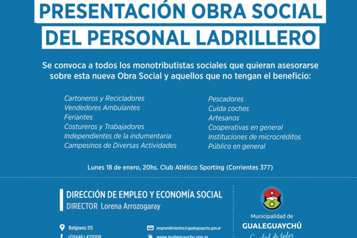 El próximo lunes 18 de enero a las 20 hs en el Club Atlético Sporting (Corrientes 377), la dirección de Empleo y Economía Social realizará la presentación de la Obra Social del Personal Ladrillero, destinada a todos los monotributistas sociales.