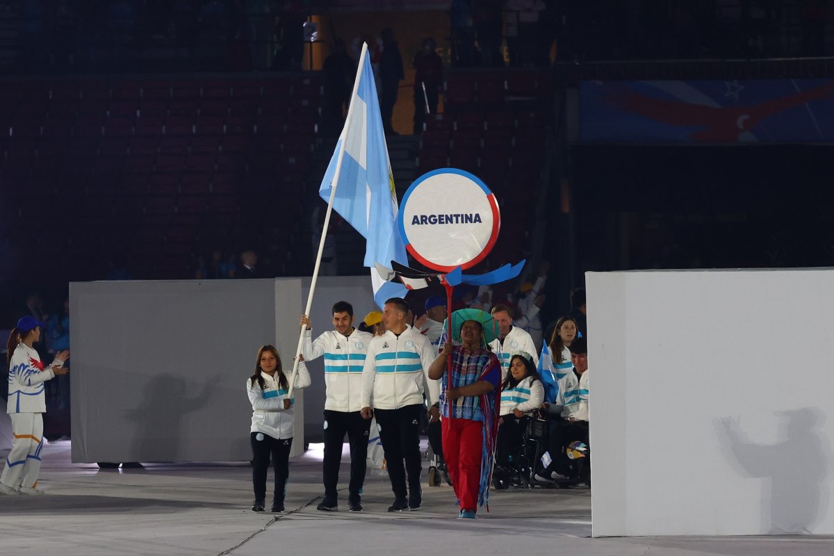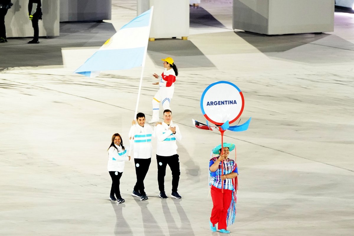 La presentación de la Delegación Argentina en Santiago 2023, estuvo liderada por los abanderados Antonella Ruiz Díaz y Ángel Deldo.