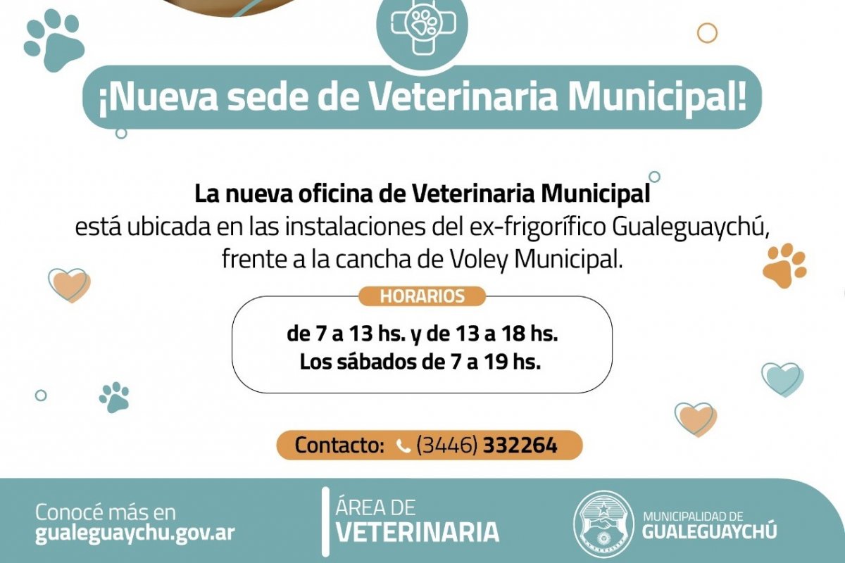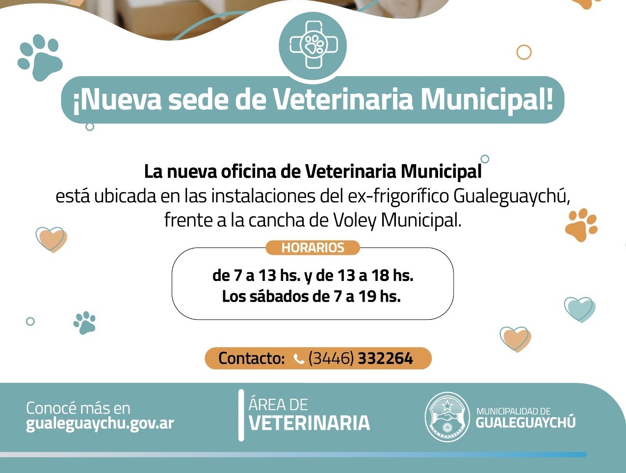 Se informa a toda la comunidad que el Área de Veterinaria Municipal se trasladó al ex Frigorífico Gualeguaychú, y sus oficinas estarán ubicadas en las instalaciones frente a la actual Cancha Municipal de Voley.
