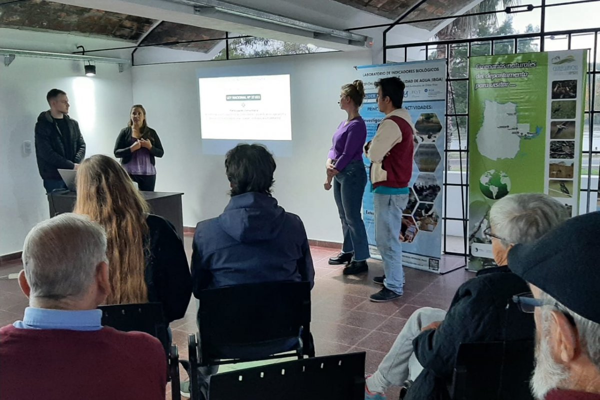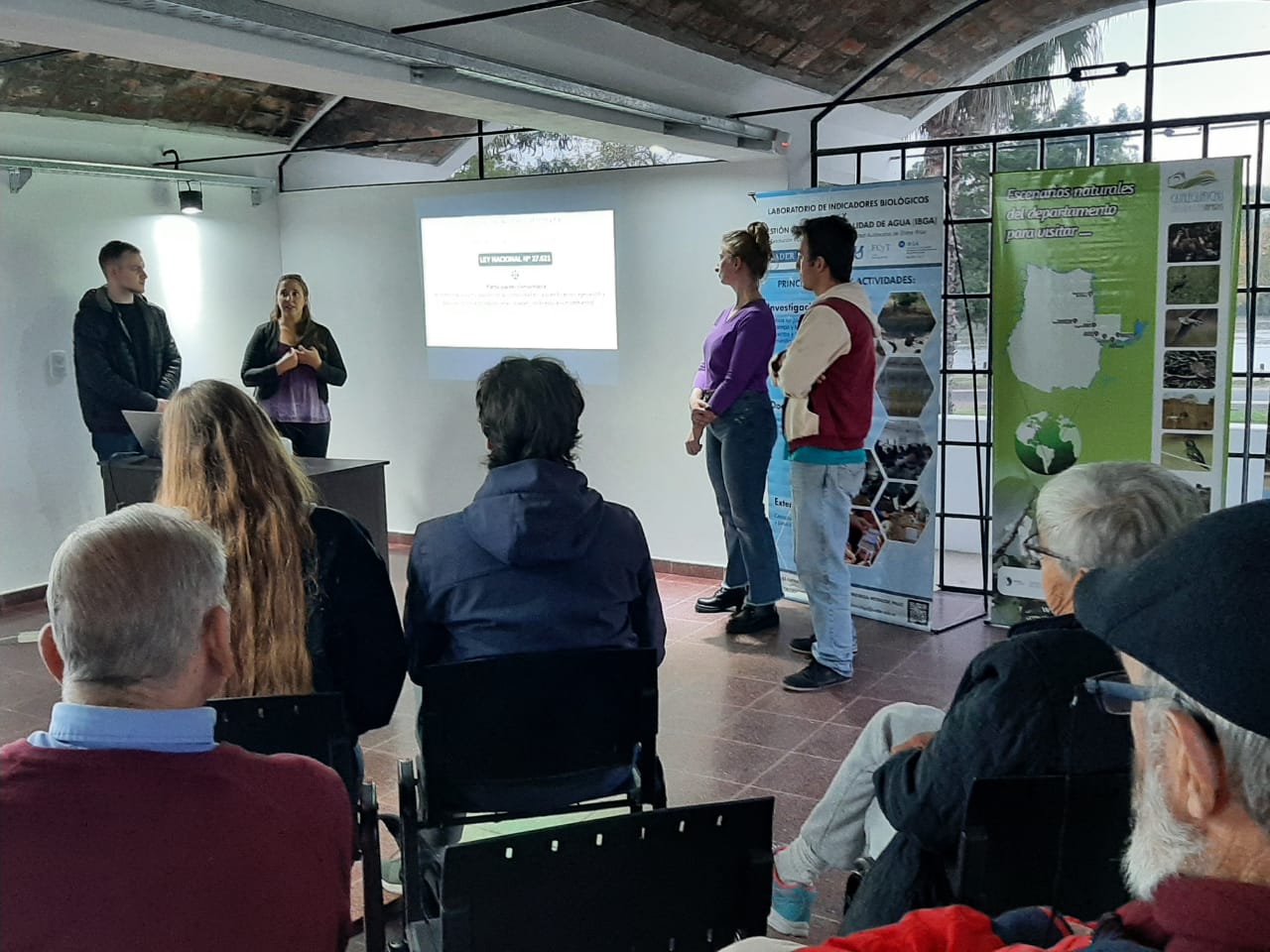 Primeramente, expusieron las graduadas Elizabeth Avila y Macarena Rein, acompañadas por los estudiantes Juan Pablo Coronel, Bruno Imanol Yacket junto a Natasha Sack sobre las actividades de investigación y extensión sobre humedales, principalmente de la cuenca baja del río Gualeguaychú, lo que ha permitido generar información sobre arroyos, sus ambientes y la vida asociada, con foco en invertebrados y microorganismos como indicadores de calidad del agua.
