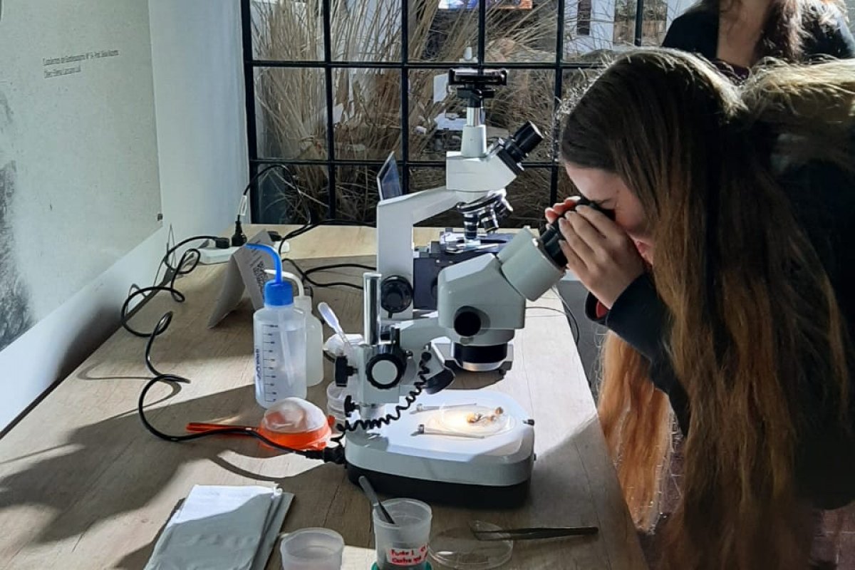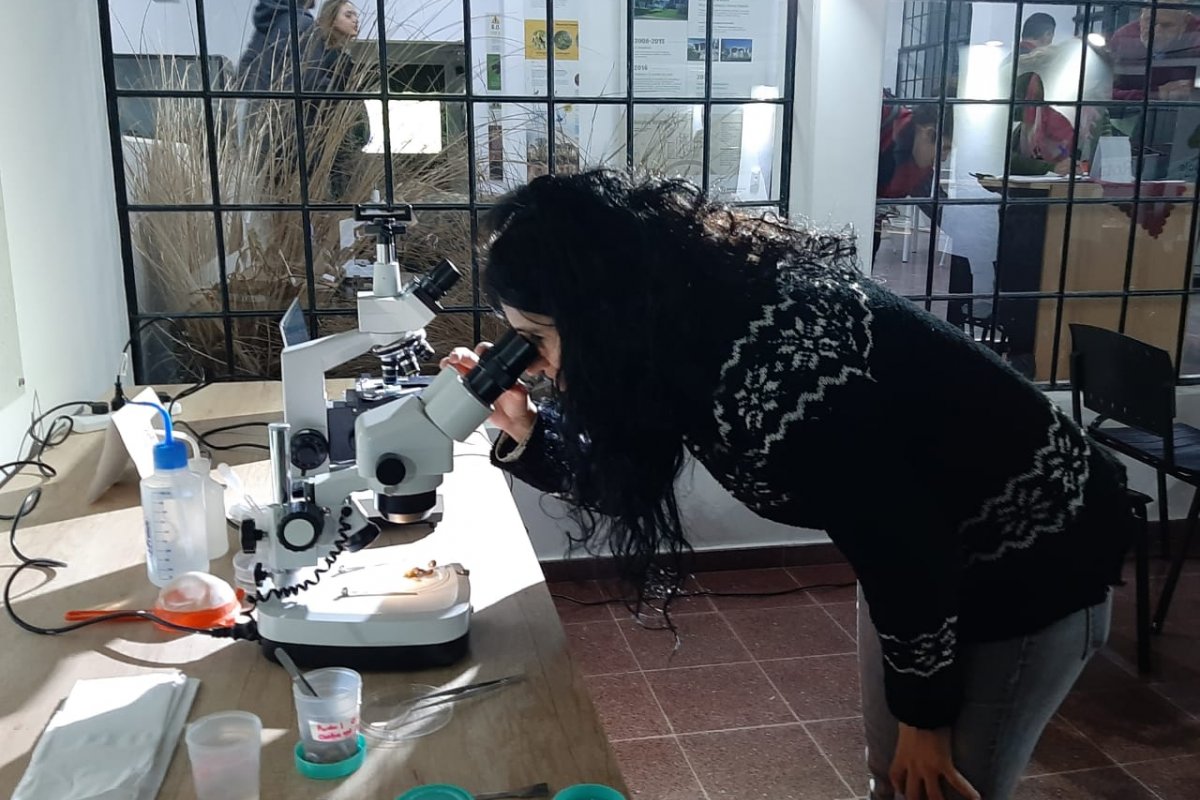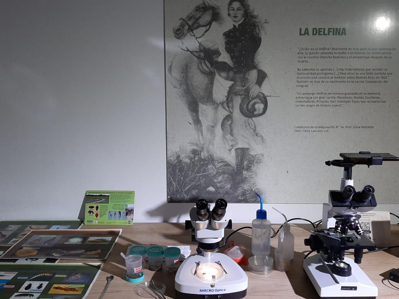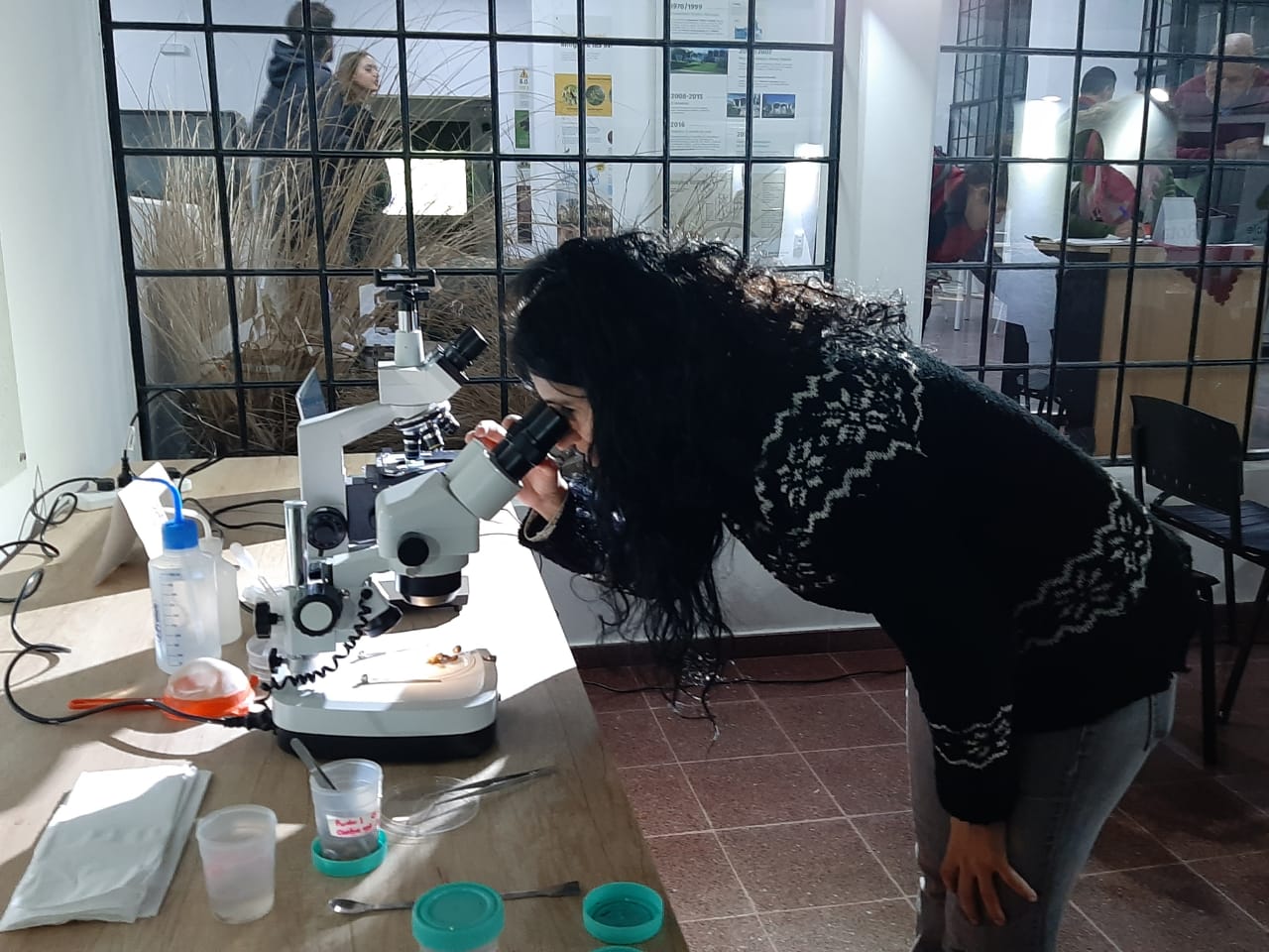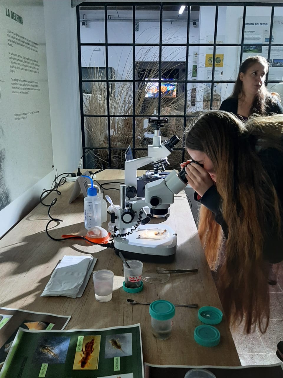 Luego de un rico intercambio de preguntas y respuestas, los participares pudieron observar los materiales biológicos y de laboratorio con uso didáctico, desplegados en dos mesas. A su vez, desde el Laboratorio hicieron entrega de juegos, lupas y placas de Petri en donación para el Centro de Interpretación del Patrimonio Natural “La Delfina”.