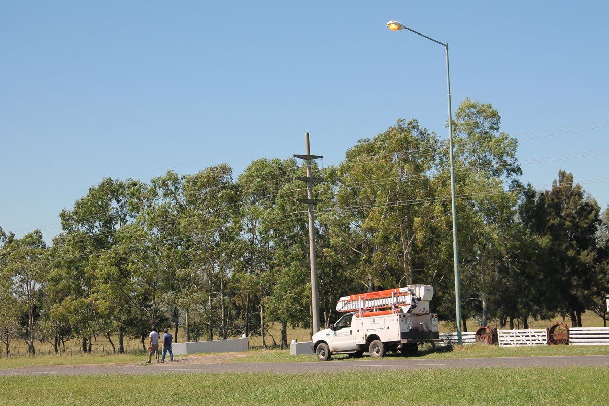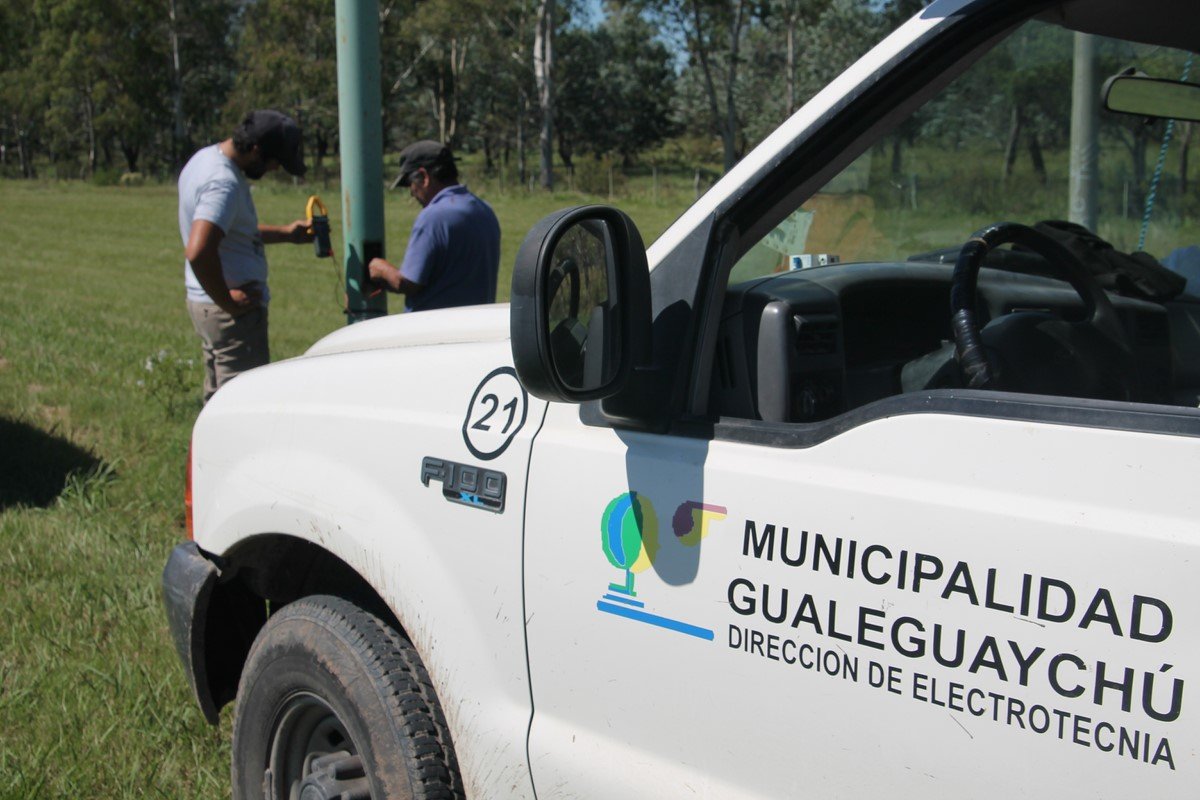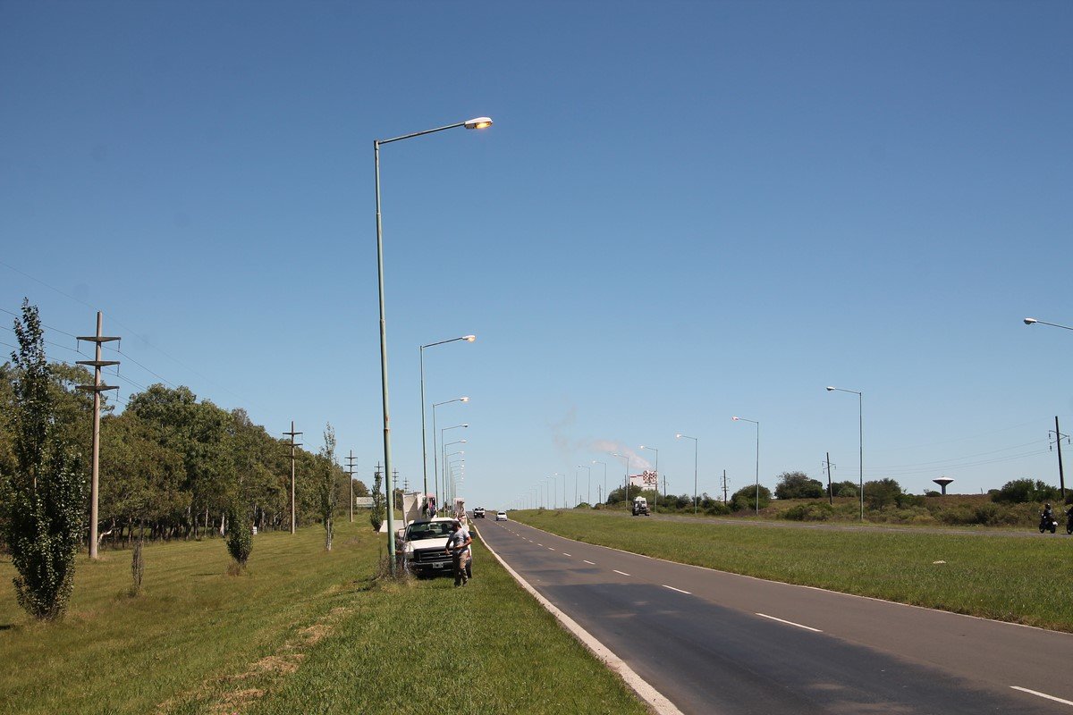 La dirección de Electrotecnia y Alumbrado Público municipal realiza trabajos en el principal acceso a la ciudad de Gualeguaychú.