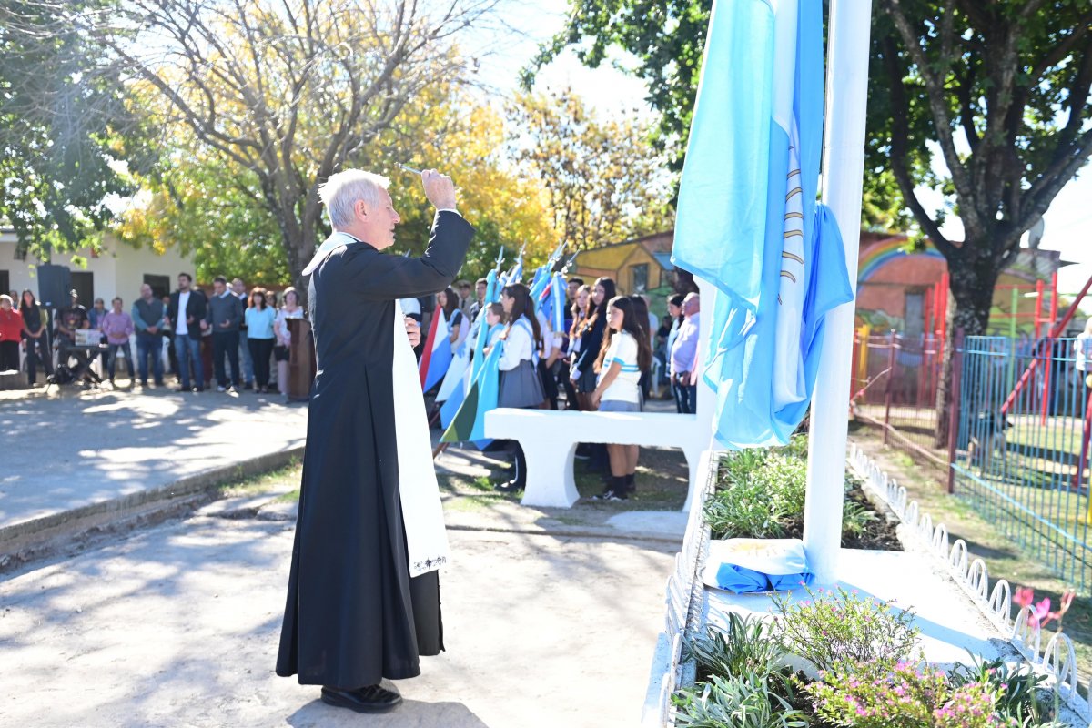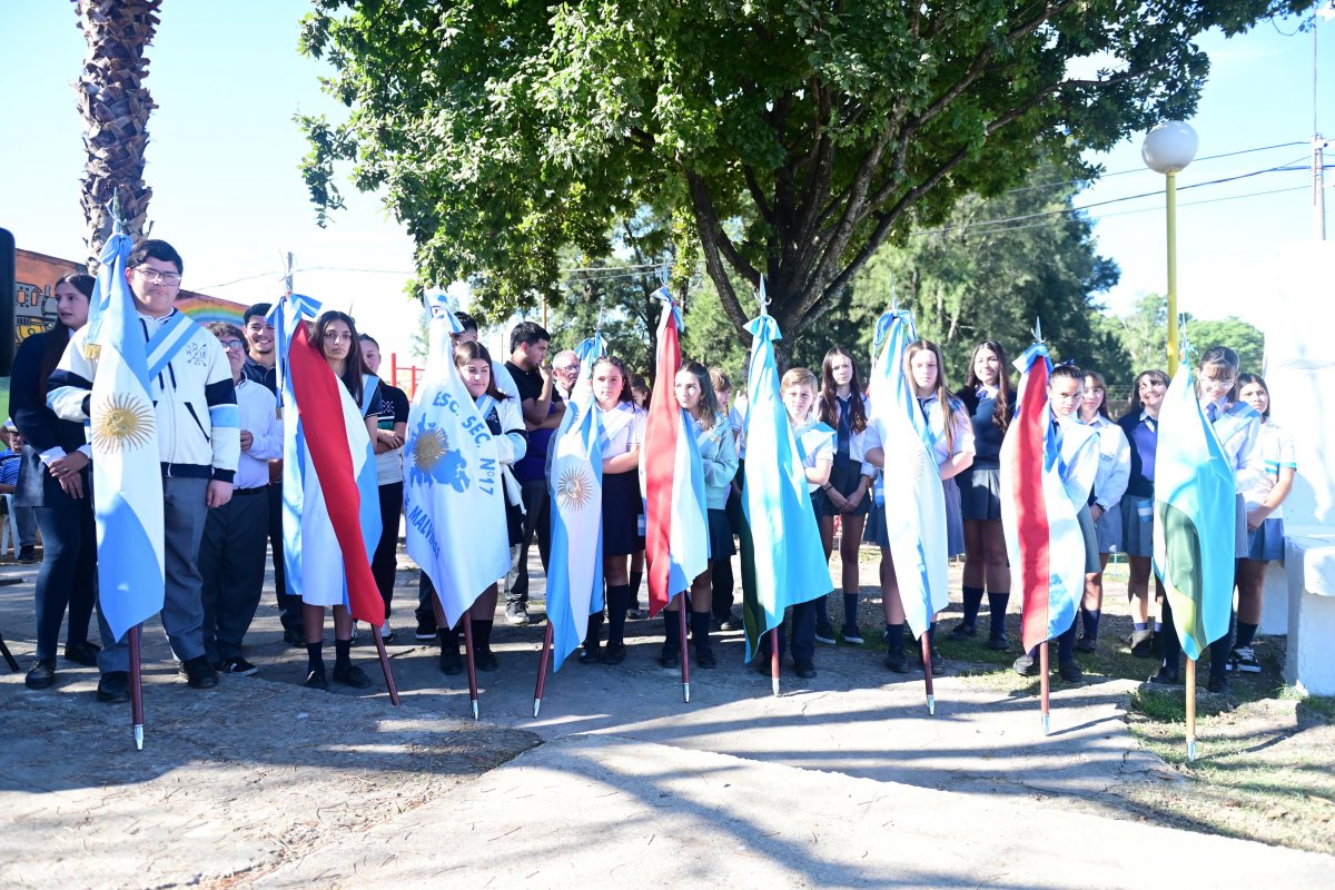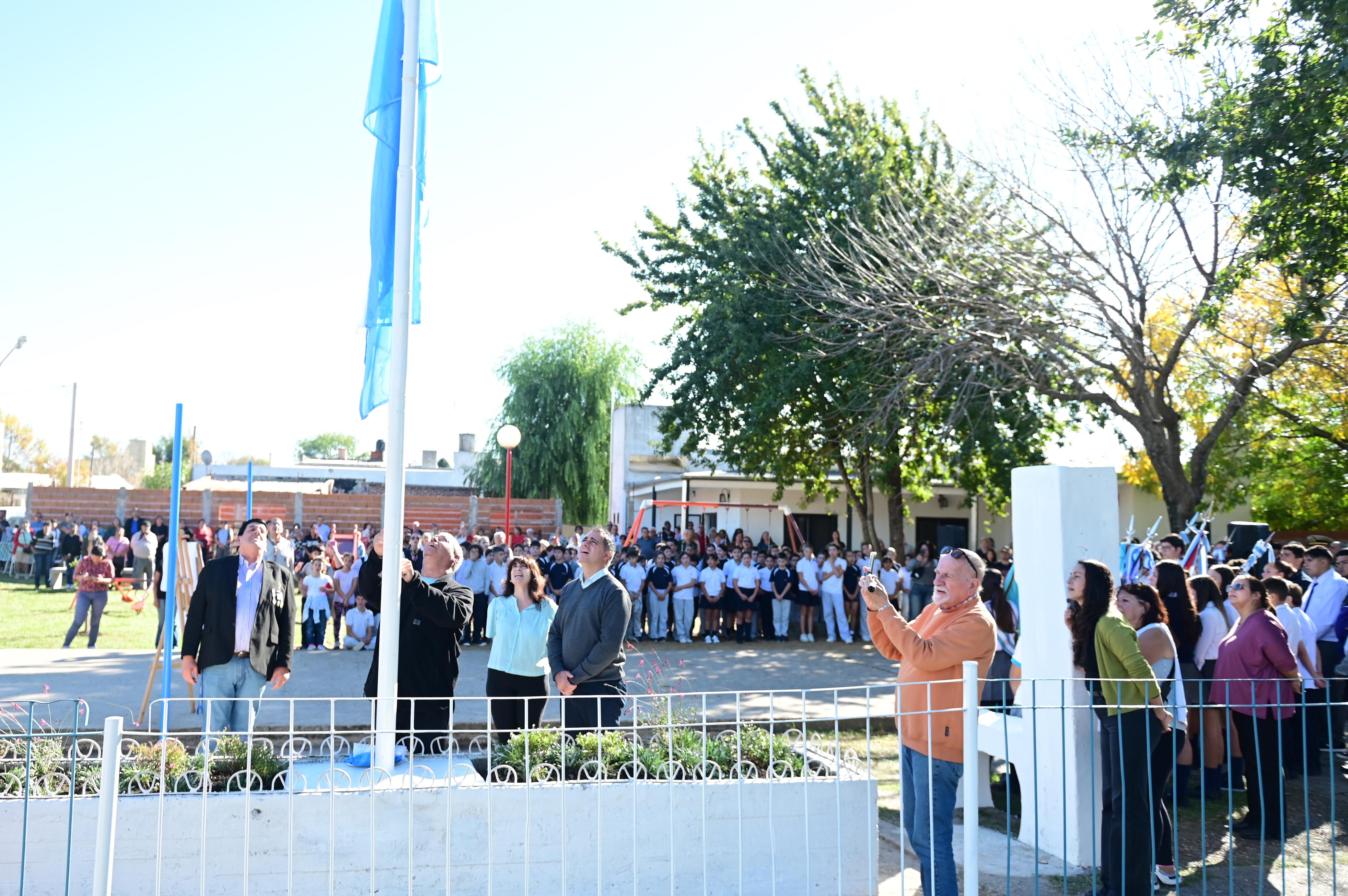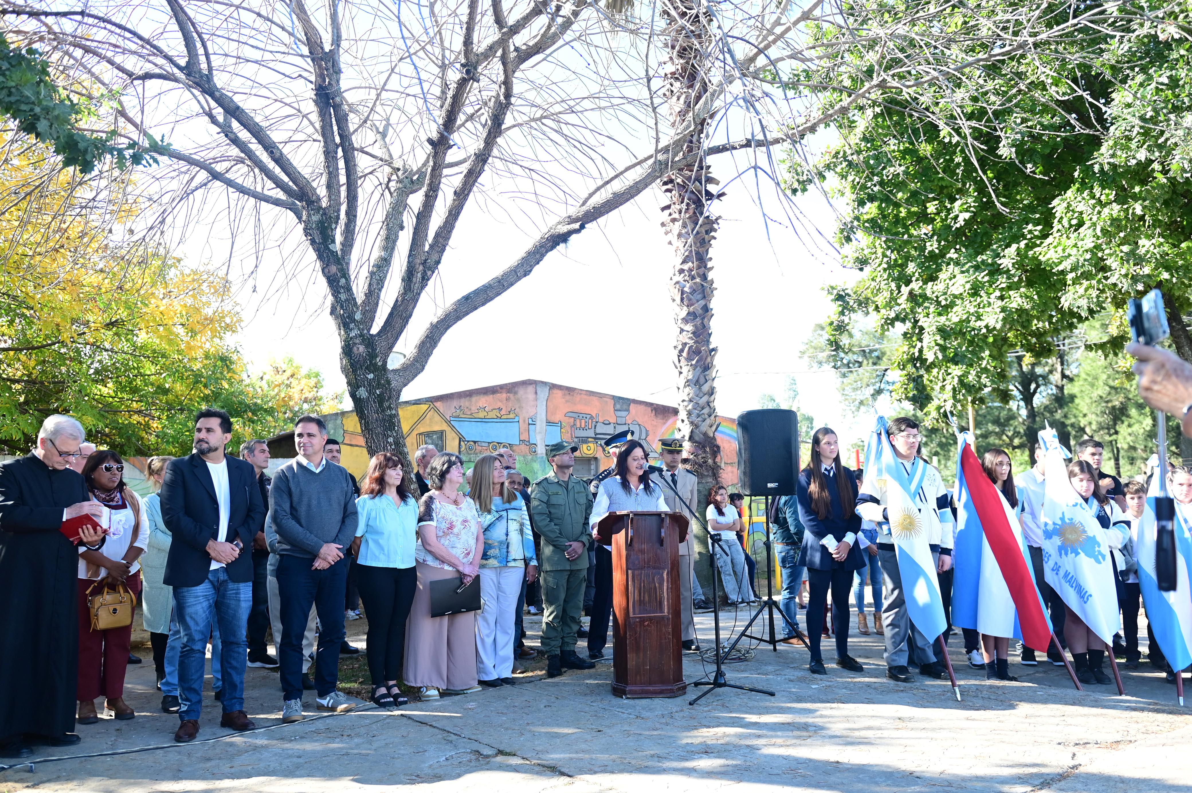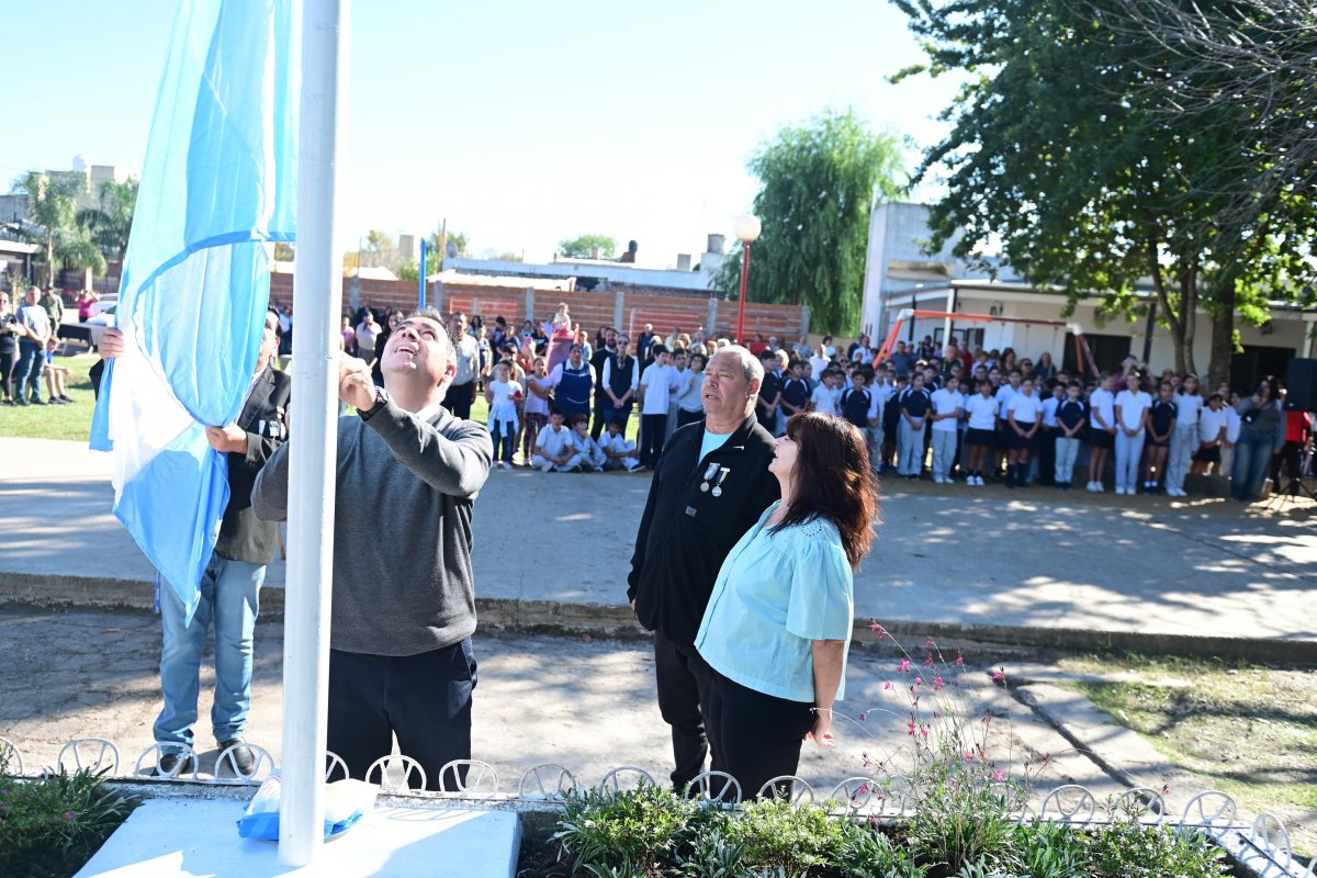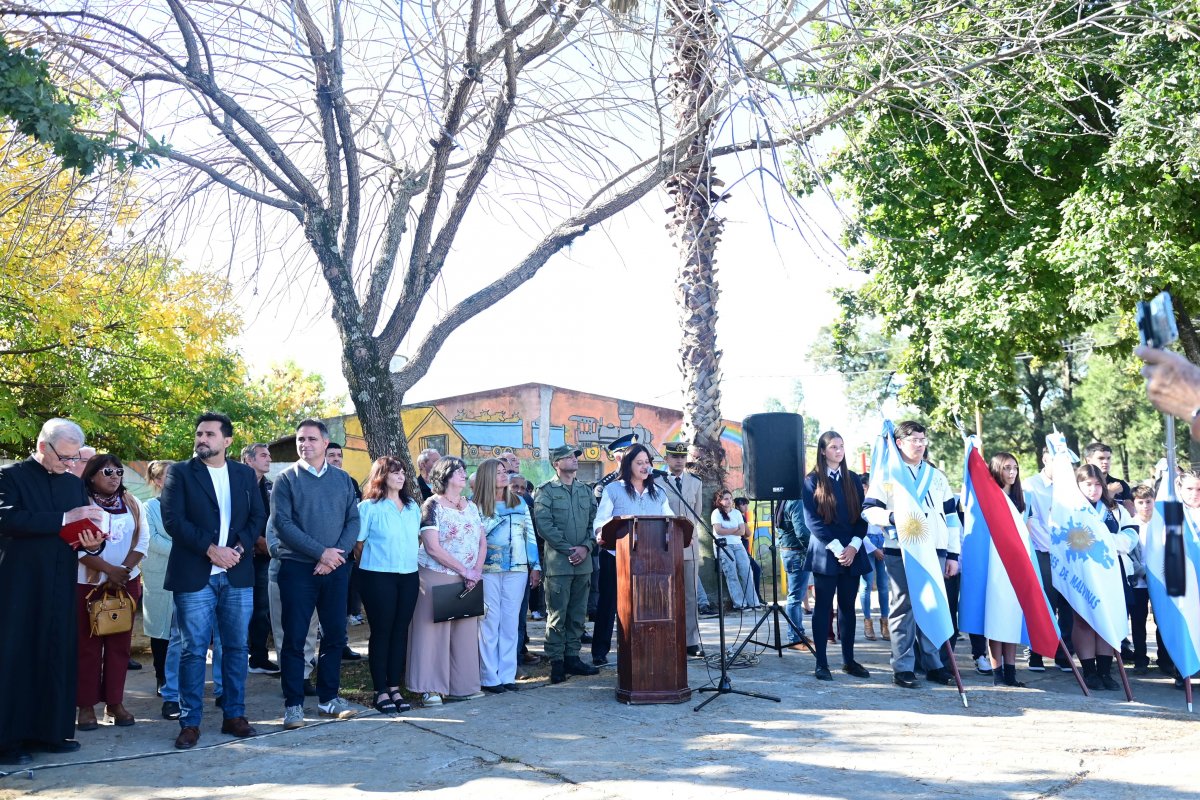 Durante el acto, se realizó la colocación de un nuevo mástil, ya que la plaza no contaba con uno, la bendición de la bandera a cargo del sacerdote Oscar Bourlot, y el descubrimiento de un cuadro alusivo a las Islas Malvinas que será colocado en el Salón de Usos Múltiples (SUM) del barrio. El cuadro fue descubierto por excombatientes de Malvinas presentes en la ceremonia, en un momento cargado de emoción y respeto.
