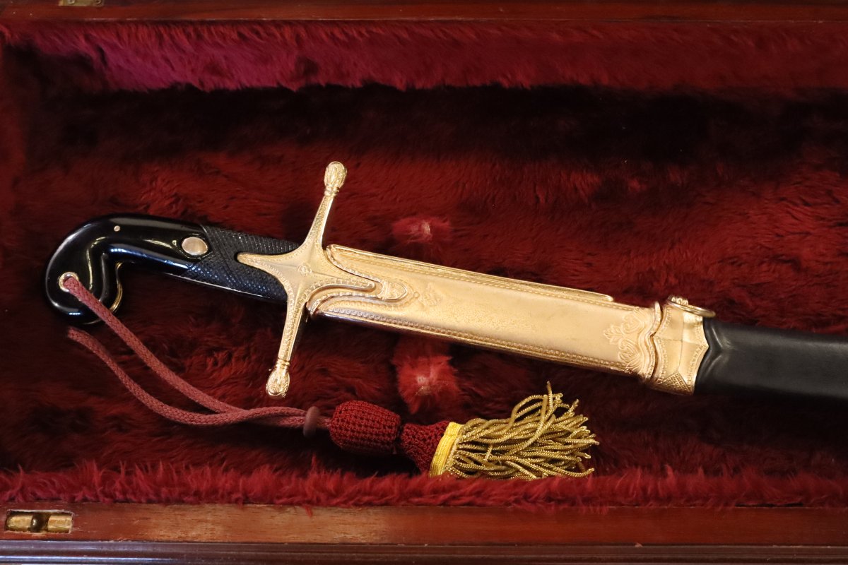 La historia de este sable remonta a 1811, cuando San Martín lo adquirió en Londres antes de embarcarse hacia el Río de la Plata. De origen árabe, fabricado en acero de Damasco con empuñadura de ébano y vaina recubierta en cuero y bronce, fue su arma de confianza durante toda la guerra de la independencia. El propio San Martín dispuso en su testamento que, tras su muerte, el sable fuera entregado al general Juan Manuel de Rosas, en reconocimiento a su defensa del honor de la República.