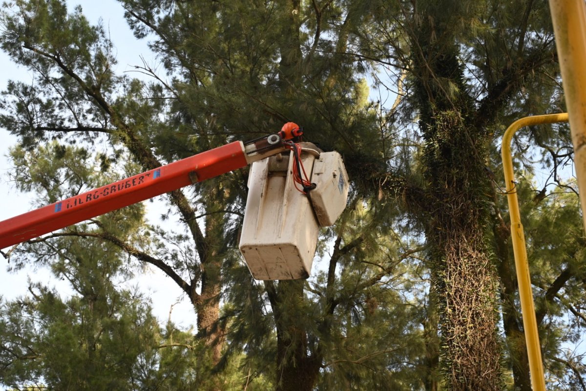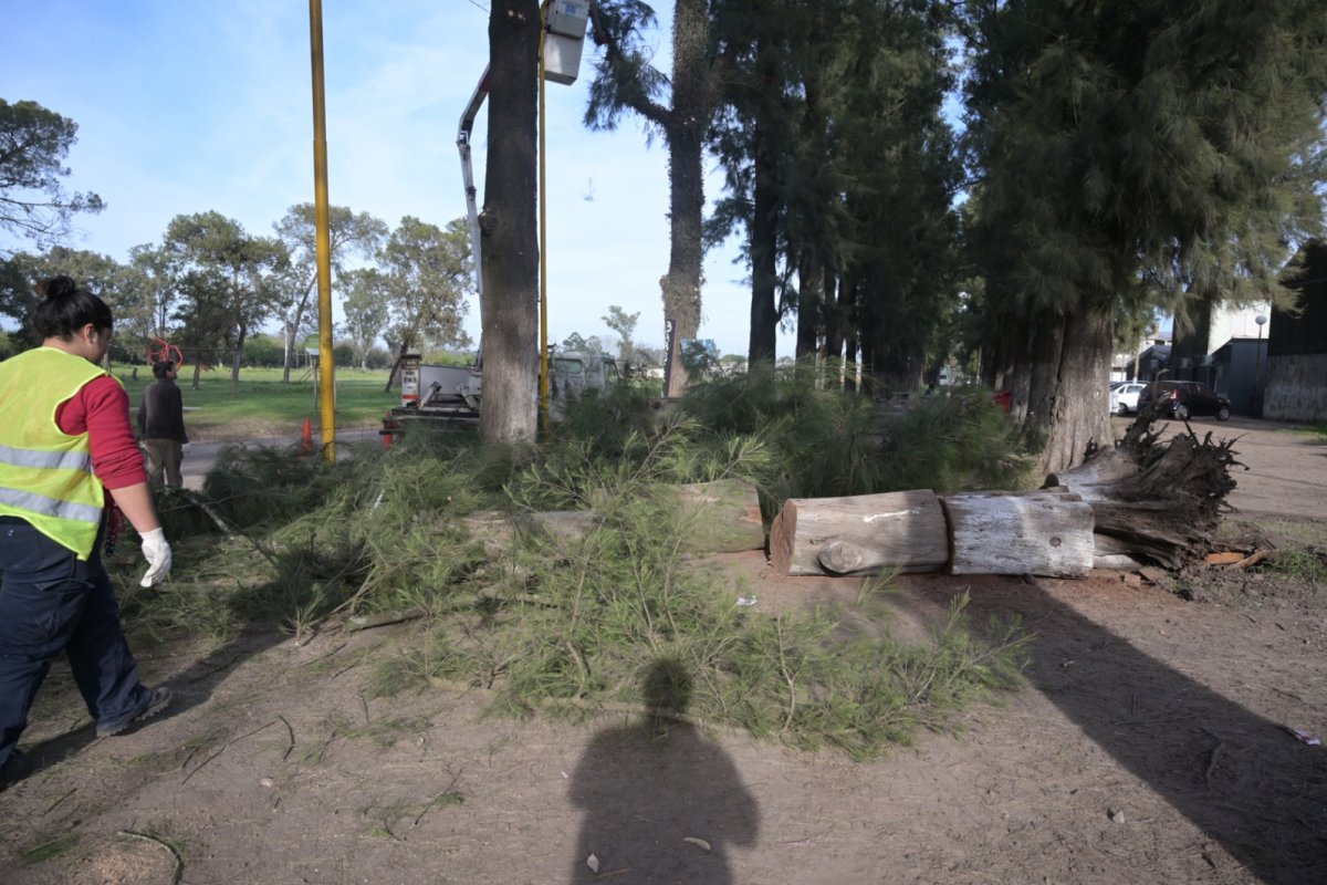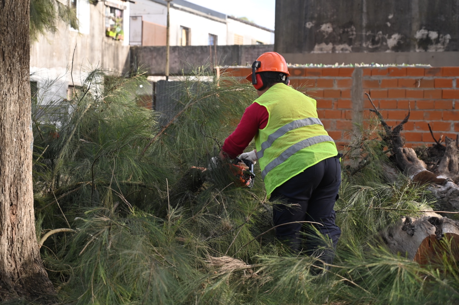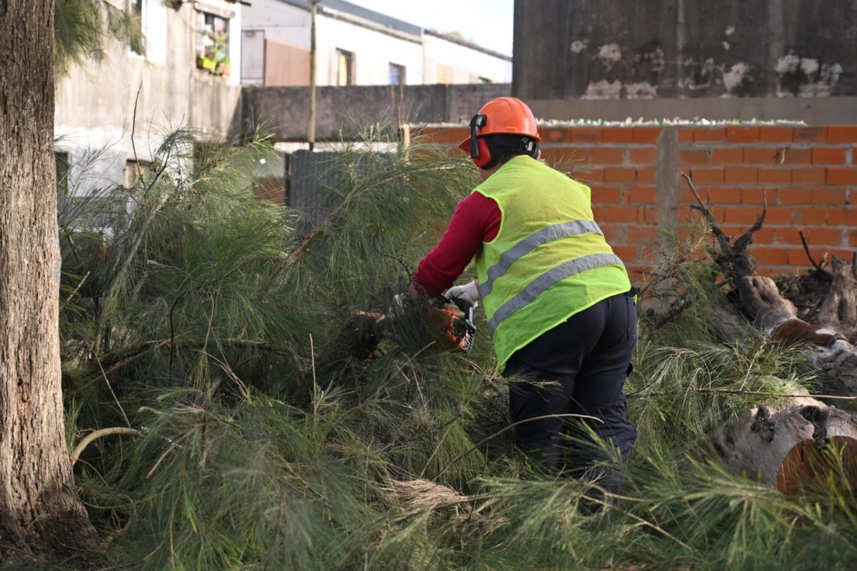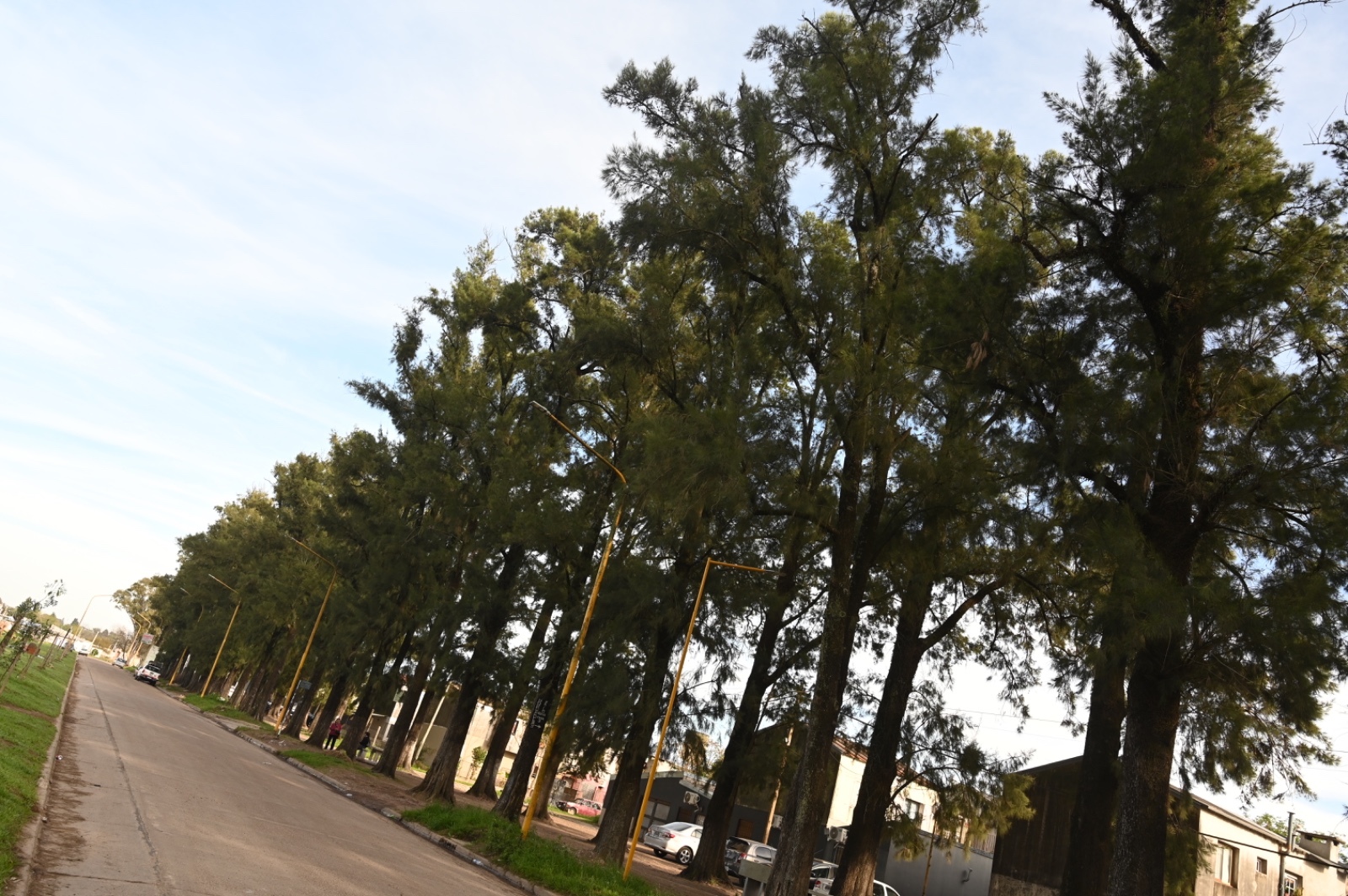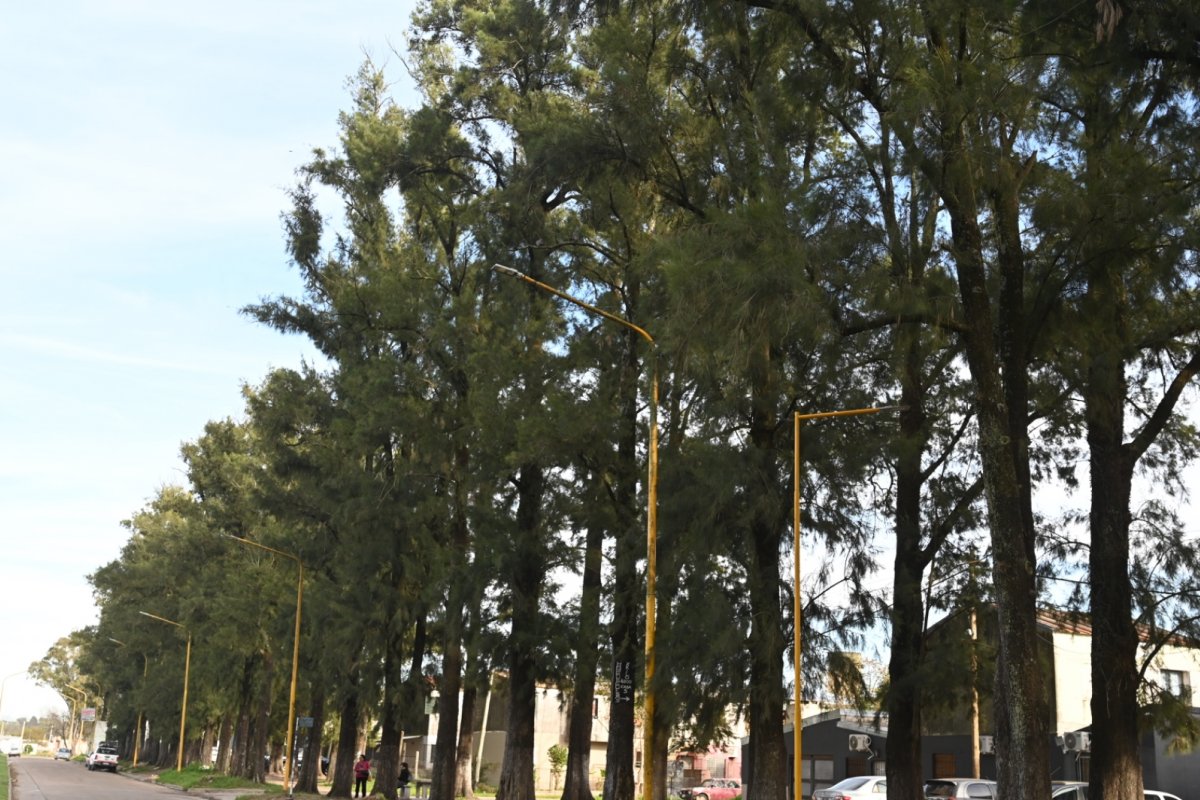Personal de Espacios Verdes realizó poda y limpieza de casuarinas para mejorar la iluminación, reforzar la seguridad en los barrios aledaños al 338 y 348 y preparar la zona para próximas obras en calles y plazas.