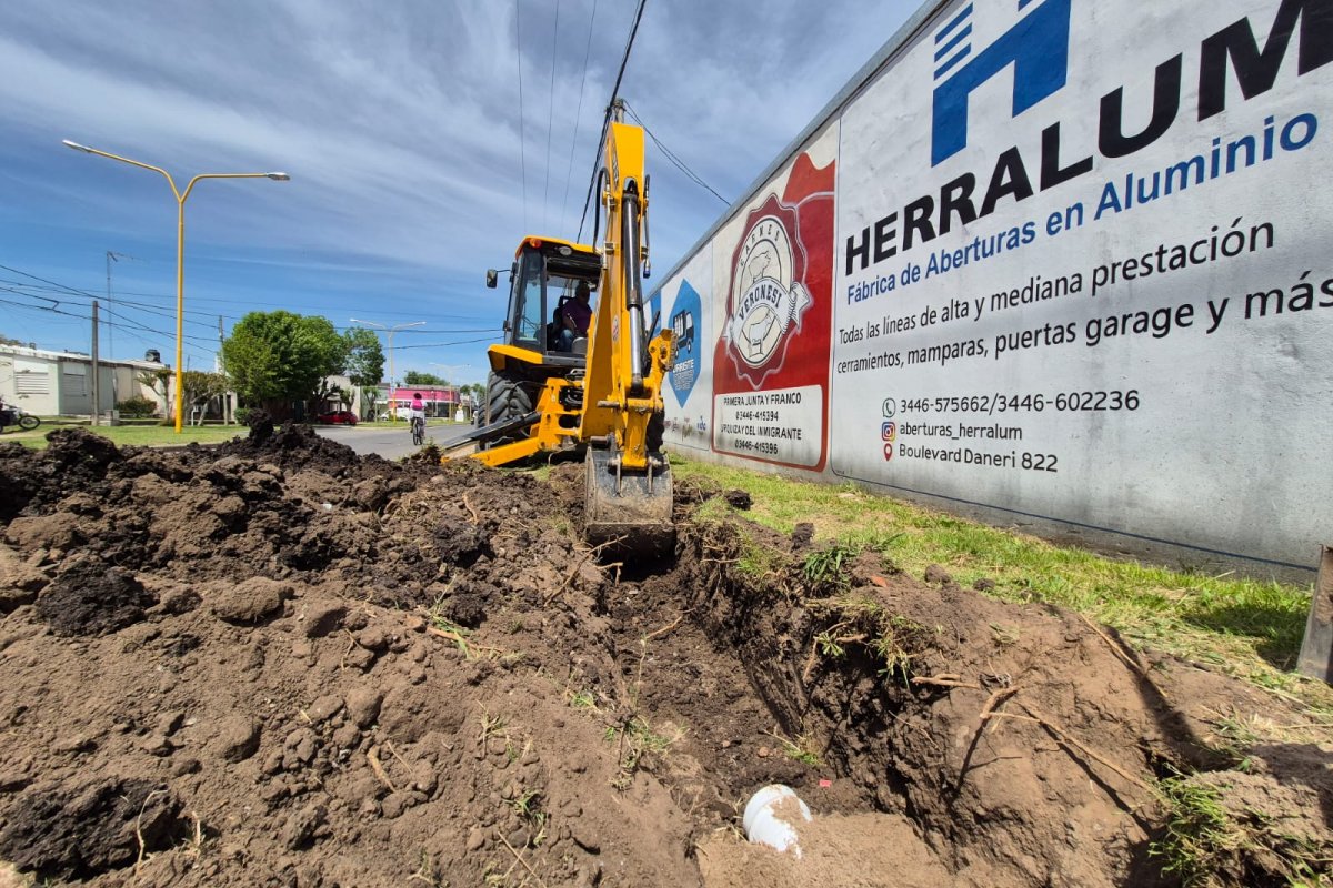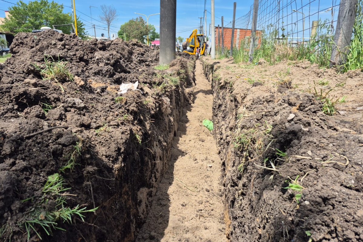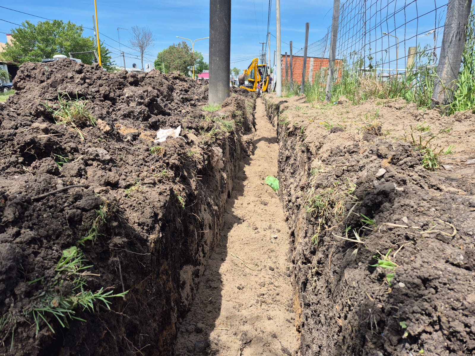 Los trabajos, ejecutados por una cuadrilla de la Dirección de Obra Pública, consisten en la extensión de la red cloacal sobre calle Nágera, entre San Martín y Andrade, para vincular el sistema del merendero que funciona dentro del predio deportivo al servicio de saneamiento.