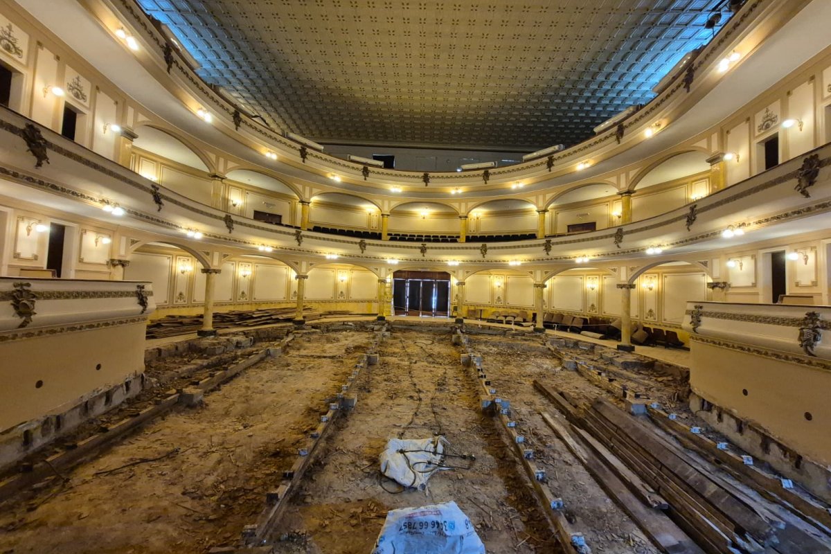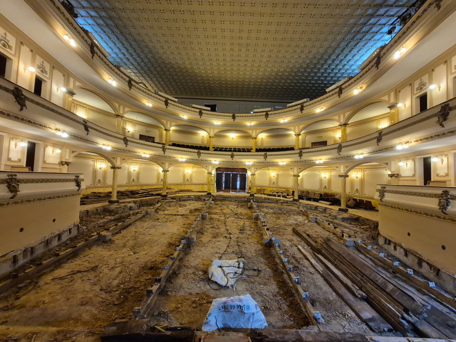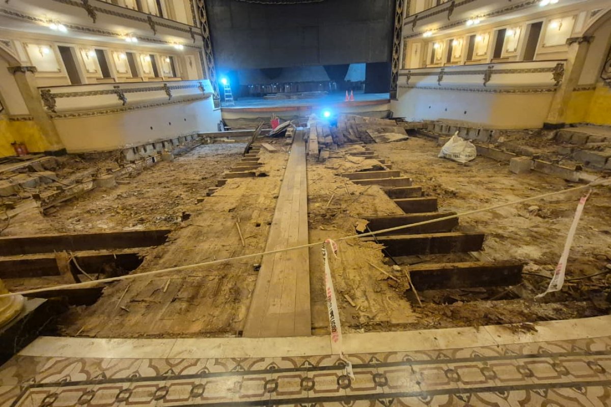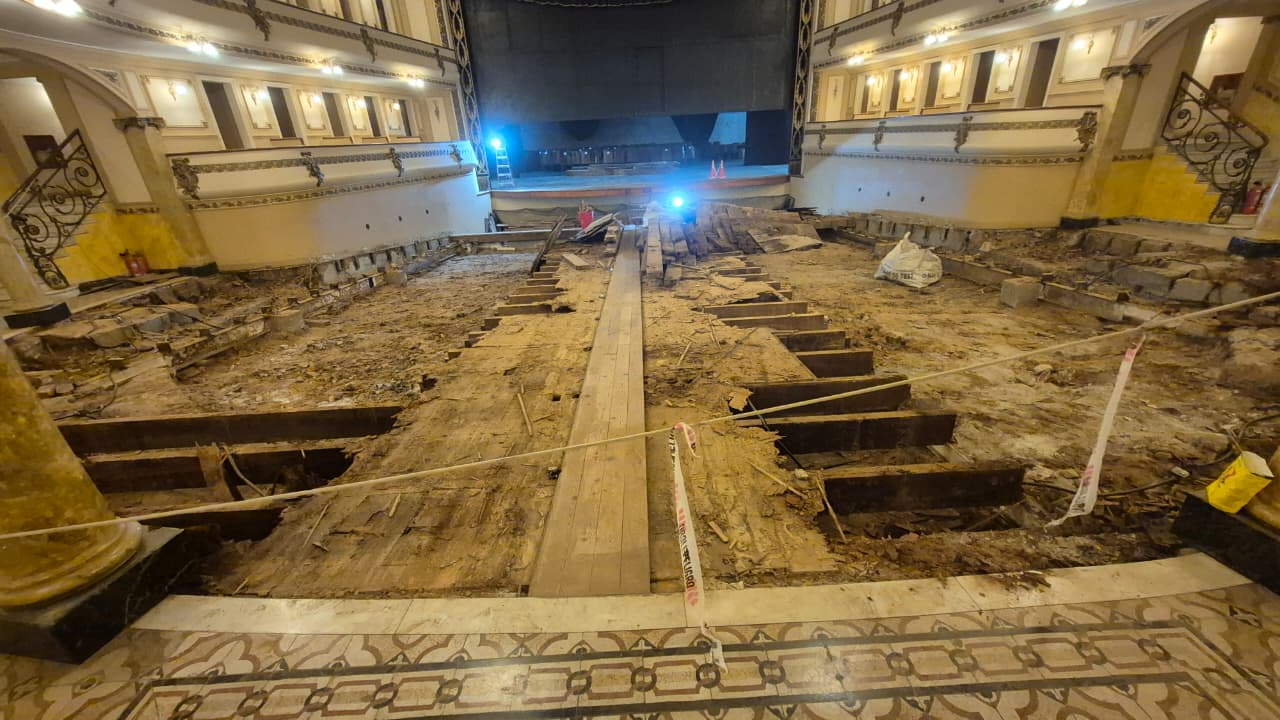 En junio pasado, se produjo el hundimiento del piso en el sector derecho del teatro —entre las filas 5 y 7 de butacas, observando desde el escenario— que generó la necesidad de una evaluación técnica exhaustiva.