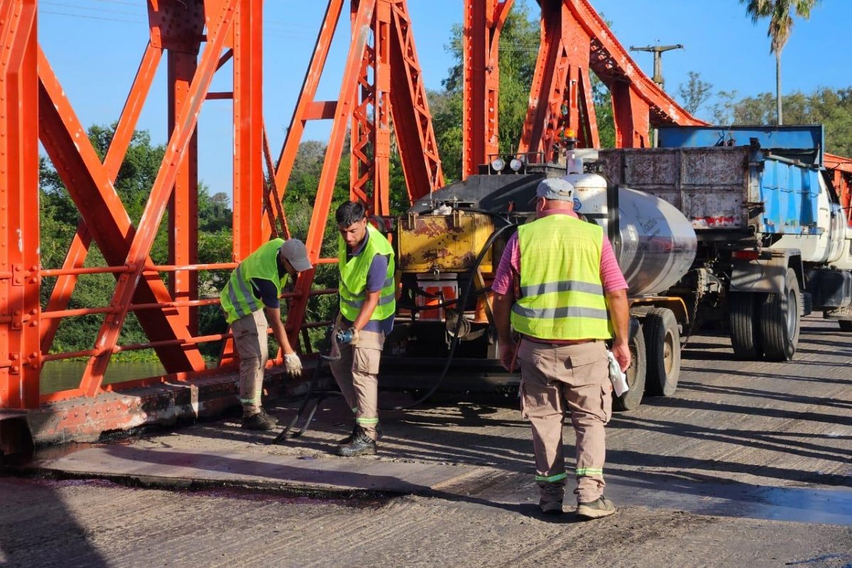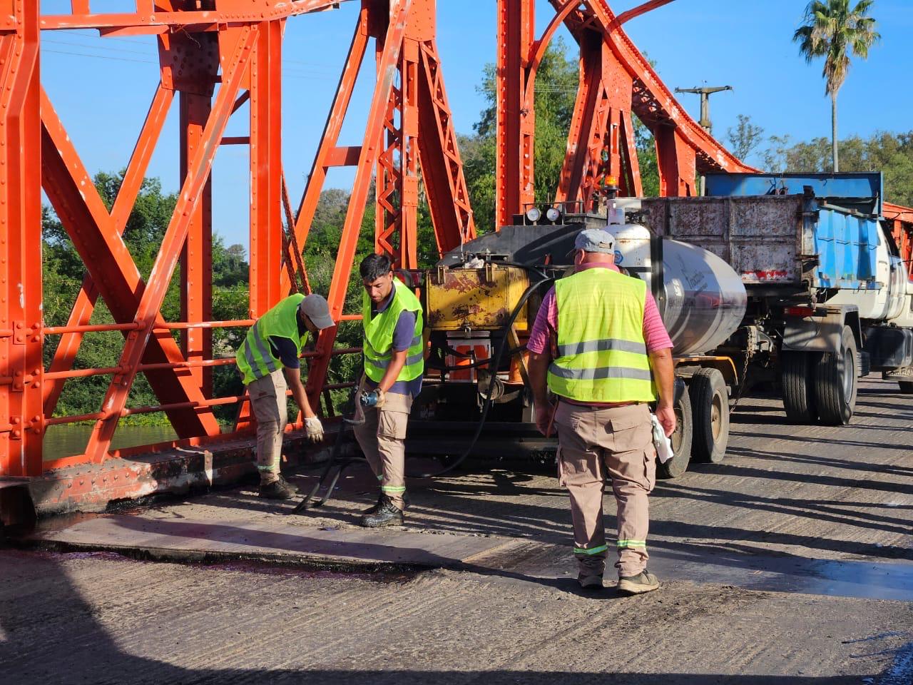La intervención incluyó tareas adicionales sobre los laterales metálicos, donde el personal ajustó bordes y repasó sectores con material asfáltico para consolidar el sellado. Con esta instancia completada, la estructura queda lista para recibir el nuevo asfalto, que sellará el proceso de restauración y devolverá al puente su capacidad plena de servicio.