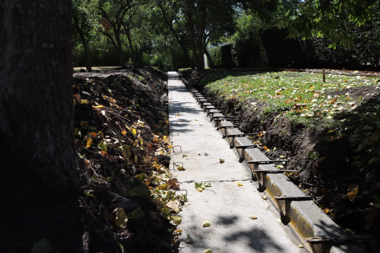 La obra incorpora encofrados metálicos, armaduras de acero, nivelación de subrasante, excavación con maquinaria vial liviana y compactación manual en zonas próximas a raíces y áreas parquizadas.