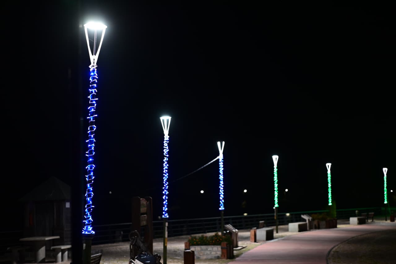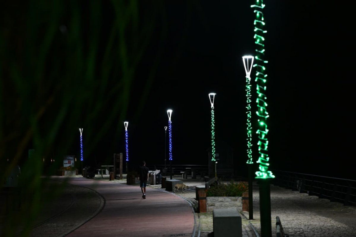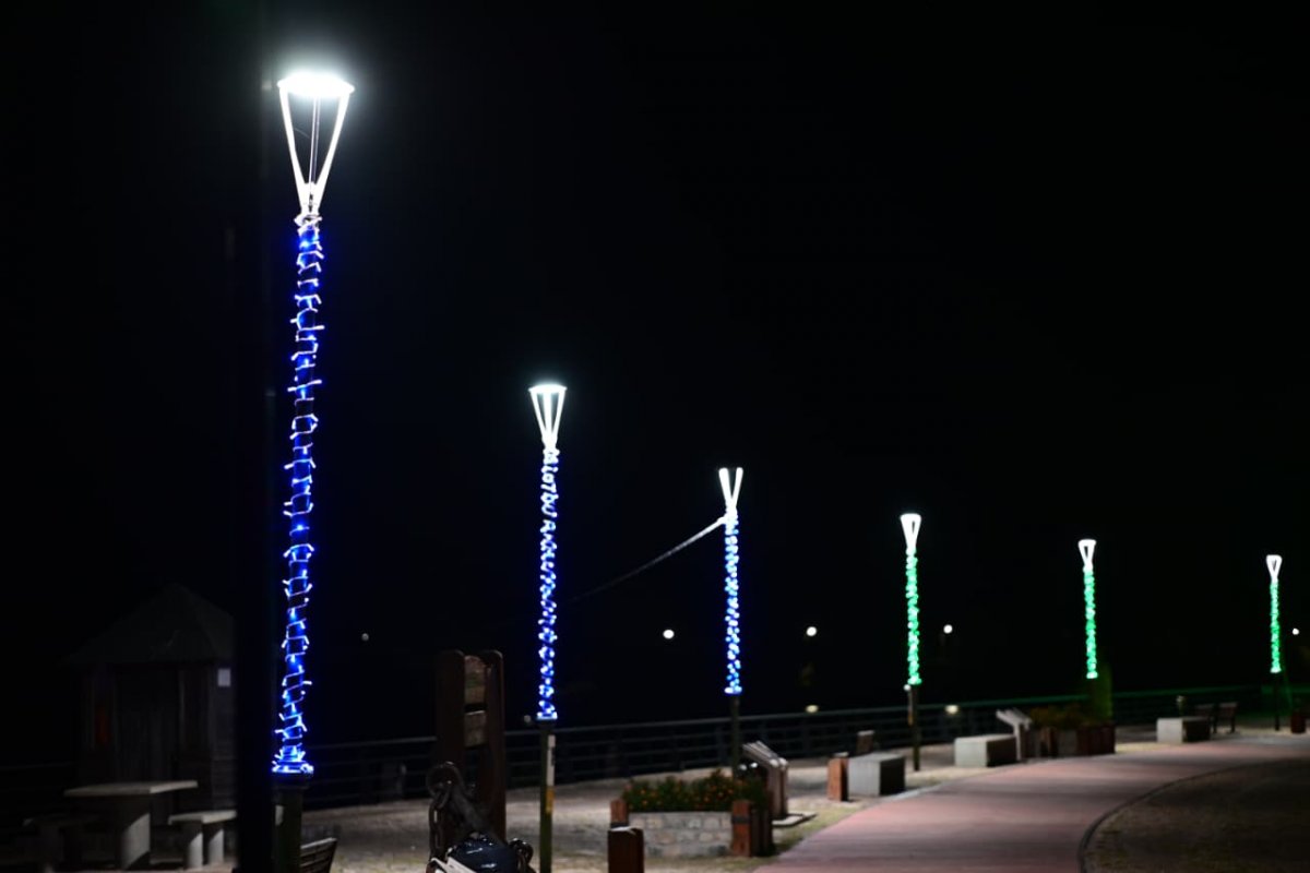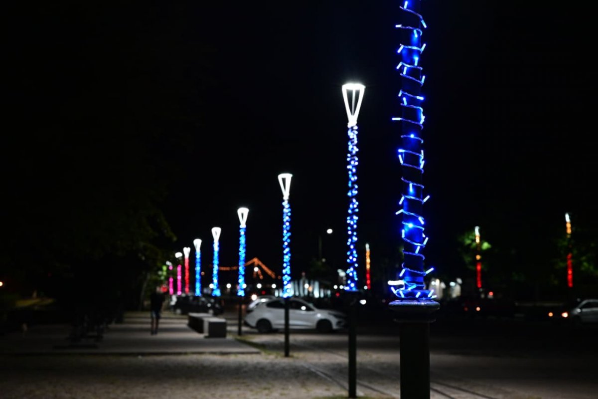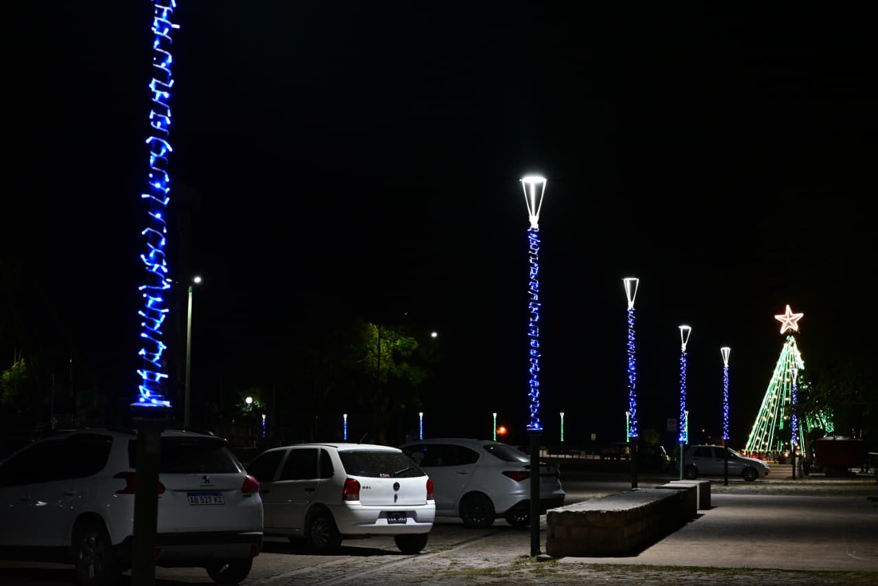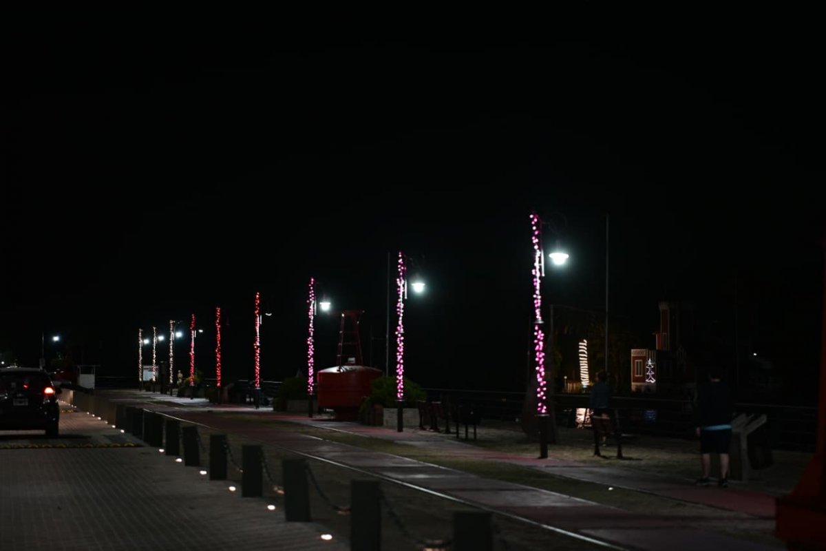 La Dirección de Energías completó tareas de embellecimiento en la Costanera y el Paseo del Puerto mediante la colocación de guirnaldas lumínicas sobre más de 120 columnas del alumbrado público.