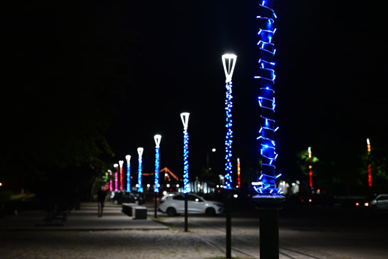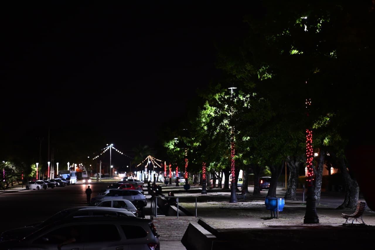 En el frente ribereño se optó por luminarias de tono dorado cálido, en tanto que en el Paseo del Puerto se incorporaron tiras en verde, rojo, azul y rosado, lo que aportó contraste visual y un clima festivo acorde a la época.