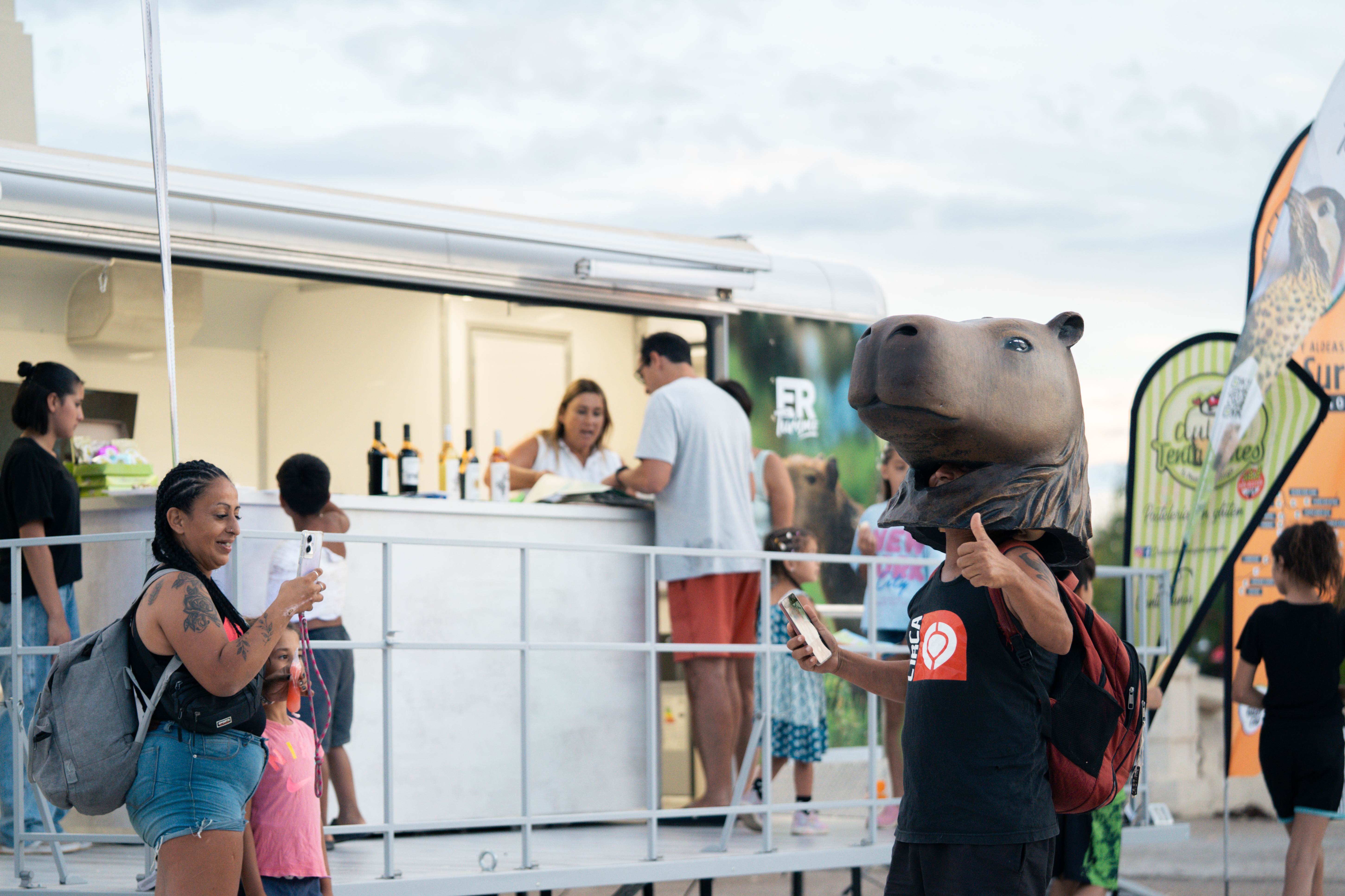 El espacio promocional también se transformó en un punto de encuentro para turistas y vecinos, que pudieron interactuar con elementos vinculados al Carnaval. Allí se ofrecieron tocados con plumas y accesorios para probarse y tomarse fotos, junto a propuestas lúdicas con la mascota de Entre Ríos, el Carpincho, que despertaron el interés y generaron momentos de diversión y participación.