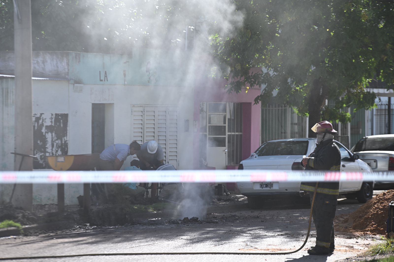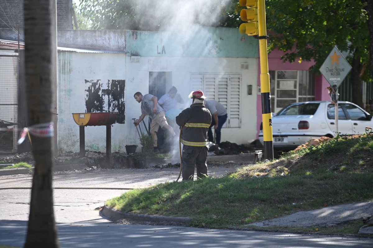 Mientras se mantenía el operativo de seguridad, personal técnico logró identificar los extremos del caño dañado, aparentemente afectado por trabajos con maquinaria pesada en la zona, y procedió a prensarlo para detener la fuga.