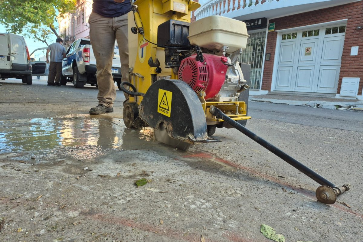 El miércoles por la mañana se dio inicio a las tareas con el corte controlado de la calzada mediante maquinaria específica para seccionamiento de hormigón, lo que posibilitó delimitar con exactitud el área de excavación y reducir el impacto sobre la circulación vehicular y peatonal.
