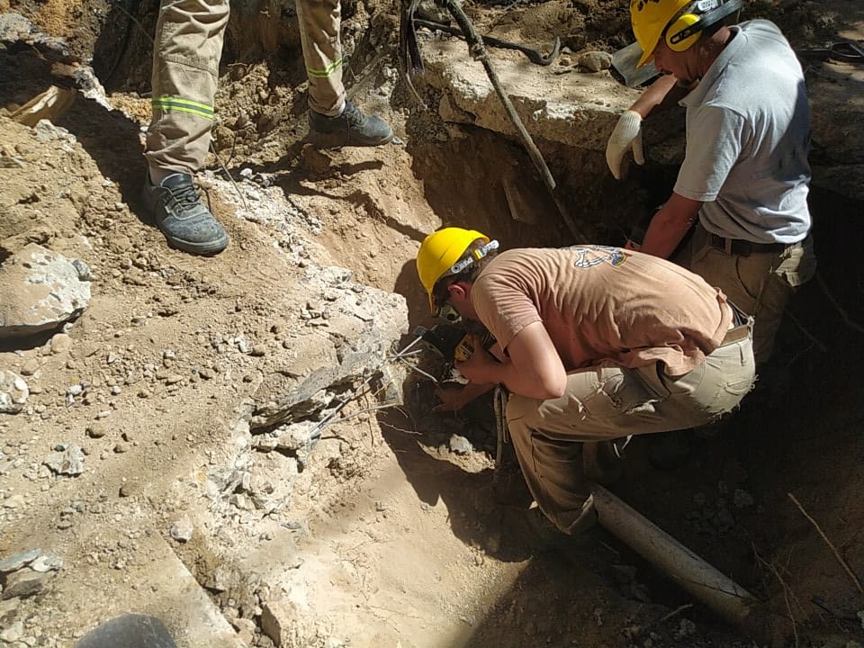 La intervención demandó la utilización de equipamiento específico, que incluyó cortadoras de pavimento con disco diamantado para apertura de calzada, martillos neumáticos para la remoción de material consolidado, retroexcavadoras para la extracción de suelo y herramientas manuales para tareas de precisión en sectores de difícil acceso.
