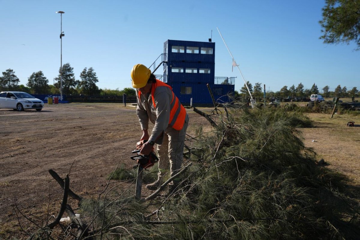 En el área de boxes, el equipo avanzó con motoguadañas para definir bordes y completar recortes en zonas de circulación y permanencia, lo que favorece la organización del espacio y mejora la accesibilidad para usuarios y equipos técnicos.