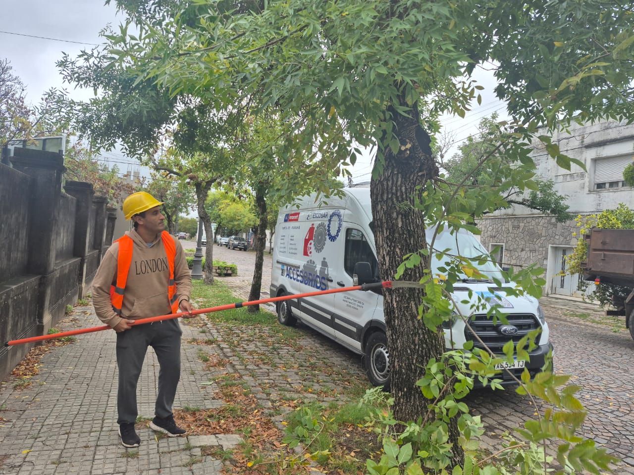 El trabajo sobre el arbolado incluyó una poda de media altura en ejemplares distribuidos a lo largo de todo el paseo, con cortes controlados orientados a mejorar la estructura de copa, liberar interferencias con luminarias y fachadas, y garantizar condiciones de seguridad para peatones y tránsito vehicular, en una operatoria que requirió herramientas manuales y equipos de corte específicos.