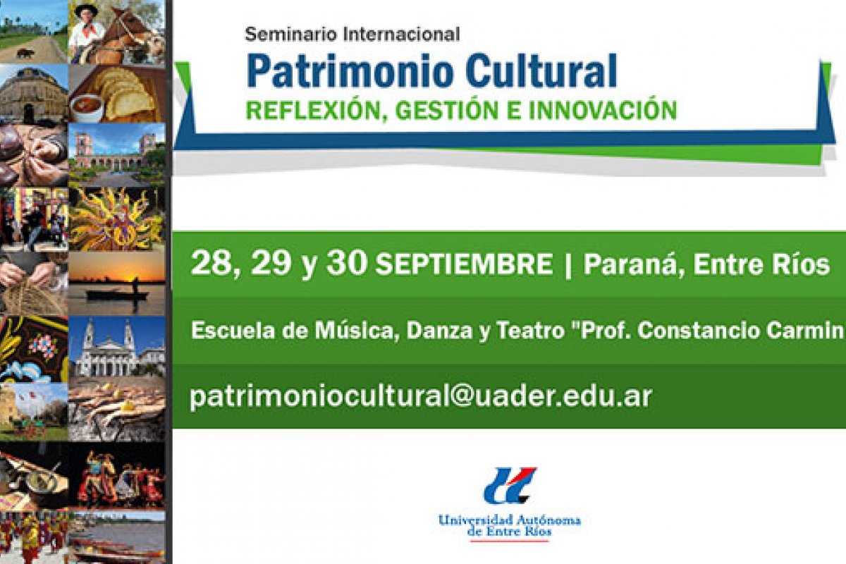 Bajo el subtítulo “Reflexión, gestión e innovación”, los días 28, 29 y 30 de septiembre, la Universidad Autónoma de Entre Ríos (UADER) presentará en la capital de la provincia el Seminario Internacional de Patrimonio Cultural. Las actividades tendrán lugar en la Escuela de Música, Danza y Teatro “Prof. Constancio Carminio” (Italia 61).