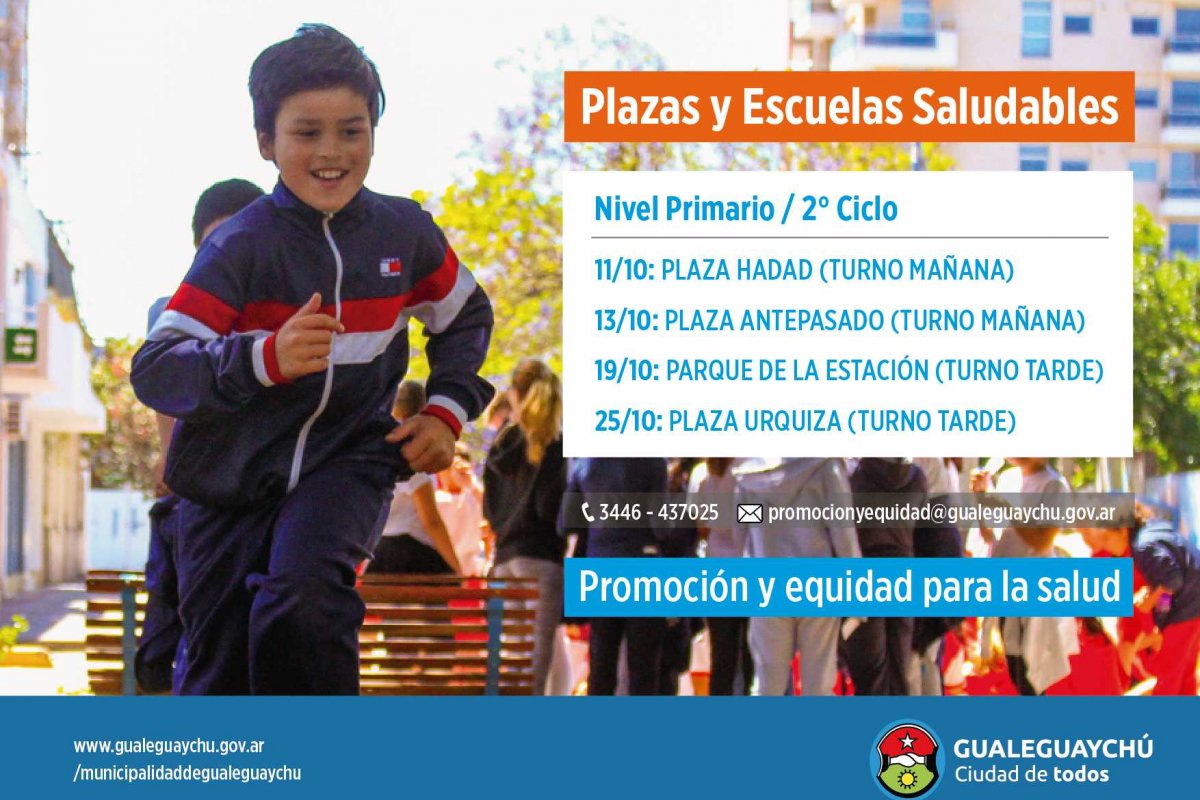 El área de Promoción y Equidad para la Salud a través del Programa Escuelas Promotoras de Salud lleva adelante el Proyecto Plazas y Escuelas Saludables para los alumnos y alumnas del Segundo Ciclo de las escuelas primarias durante el mes de octubre. Las actividades serán en diferentes plazas de los barrios de la ciudad donde se desarrollarán actividades de promoción de la salud: alimentación saludable, salud bucal, actividad física, vacunación, ambientes libres de humo de tabaco entre propuestas de Deportes, Arte y Cultura, Medio ambiente y Educación vial y donde las escuelas también podrán difundir y socializar sus proyectos respectivos.