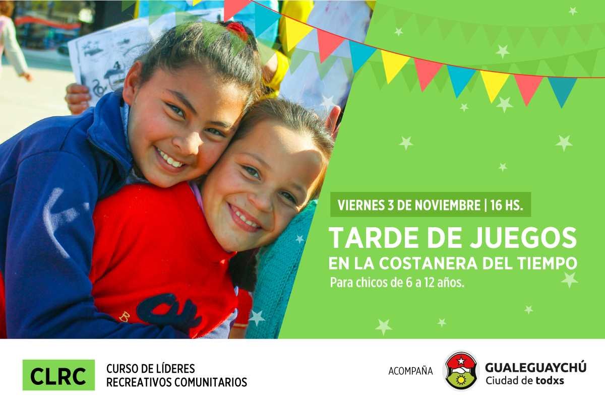 En la tarde del viernes 3 de noviembre se llevará adelante un taller de juegos en la Costanera del Tiempo, que continuará con una capacitación el día sábado en el Centro Cultural Gualeguaychú (CCG). Estas jornadas tienen su origen en el Curso de Líderes Recreativos Comunitarios del Programa Adolescencia de la Secretaría de Desarrollo Social del gobierno de la provincia de Bs. As. y que tiene como finalidad la promoción del juego y actividades deportivas y turísticas como herramientas de formación y desarrollo para jóvenes y niños.