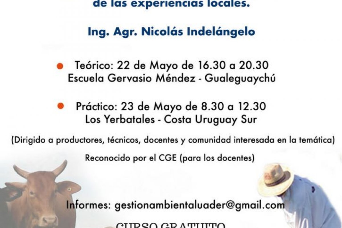 Esta actividad, organizada por la Licenciatura en Gestión Ambiental de la Sede Gualeguaychú de la Facultad de Ciencia y Tecnología de UADER, consta de una parte teórica, que será dictada el 22 de mayo de 16:30 a 20:30 hs en la Escuela G. Méndez (Rivadavia y Magnasco) y una parte práctica a realizarse el 23 de mayo de 8:30 a 12:30 hs en Los Yerbatales - Costa Uruguay Sur (para lo cual deben contar con movilidad propia). Está dirigida a Productores, técnicos, docentes y comunidad en general.