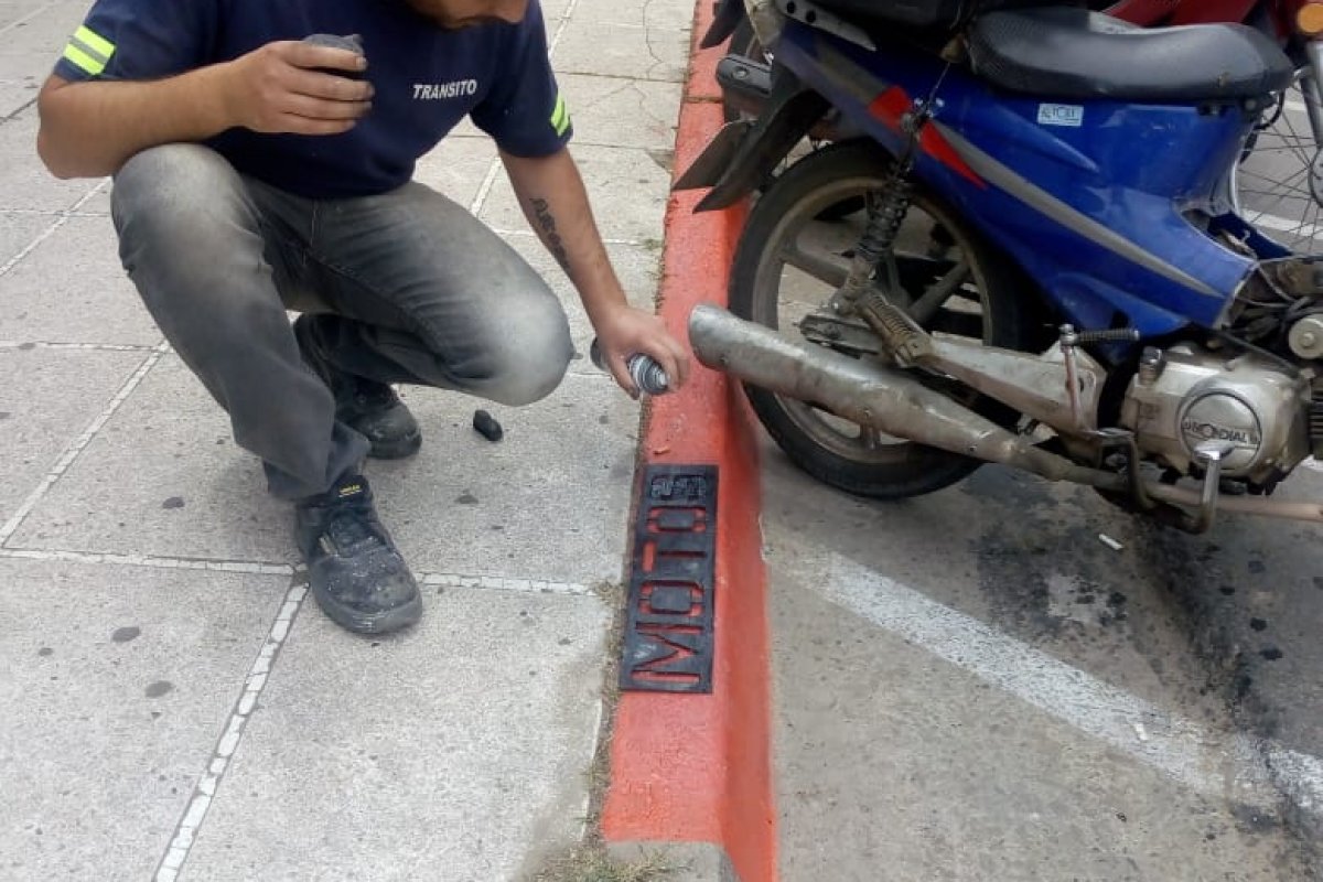 La dirección de Tránsito Municipal realiza el pintado de compartimentos con pintura blanca y cordón naranja más la leyenda “motos” en el cuadrante de calles Urquiza y 25 de Mayo, entre Avenida Rocamora y Mitre.