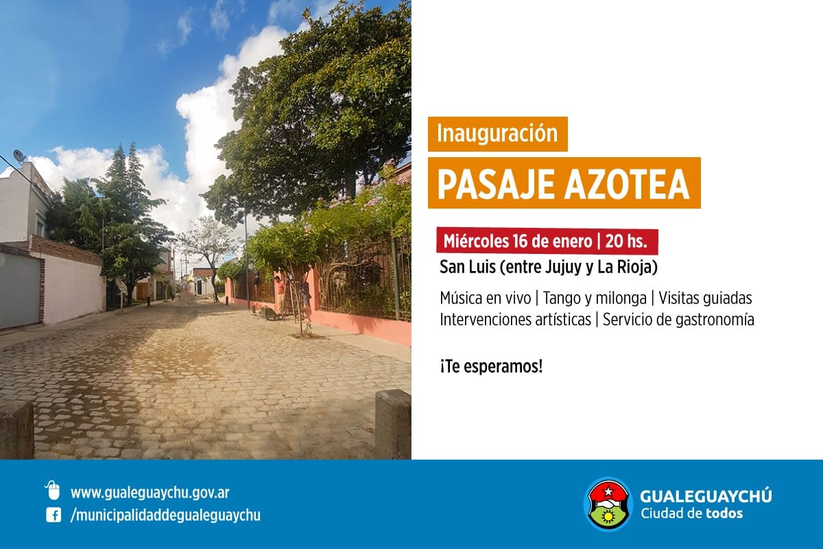La dirección de Cultura Municipal realizará la inauguración del Pasaje Azotea que incluye la puesta en valor del frente del museo, de los antiguos adoquines de la calle, luminarias y limitación del tránsito pesado. Durante la actividad todos los vecinos de la ciudad podrán disfrutar de espectáculos de tango, milonga, estatuas vivientes, actores interviniendo en el lugar, exposición de fotografías antiguas en la calle y en el espacio del museo, percusión musical, arte efímero y un servicio gastronómico que estará a cargo del el grupo de voluntarios que representa a las ONG´s de Gualeguaychú “Un día por mil sueños”.