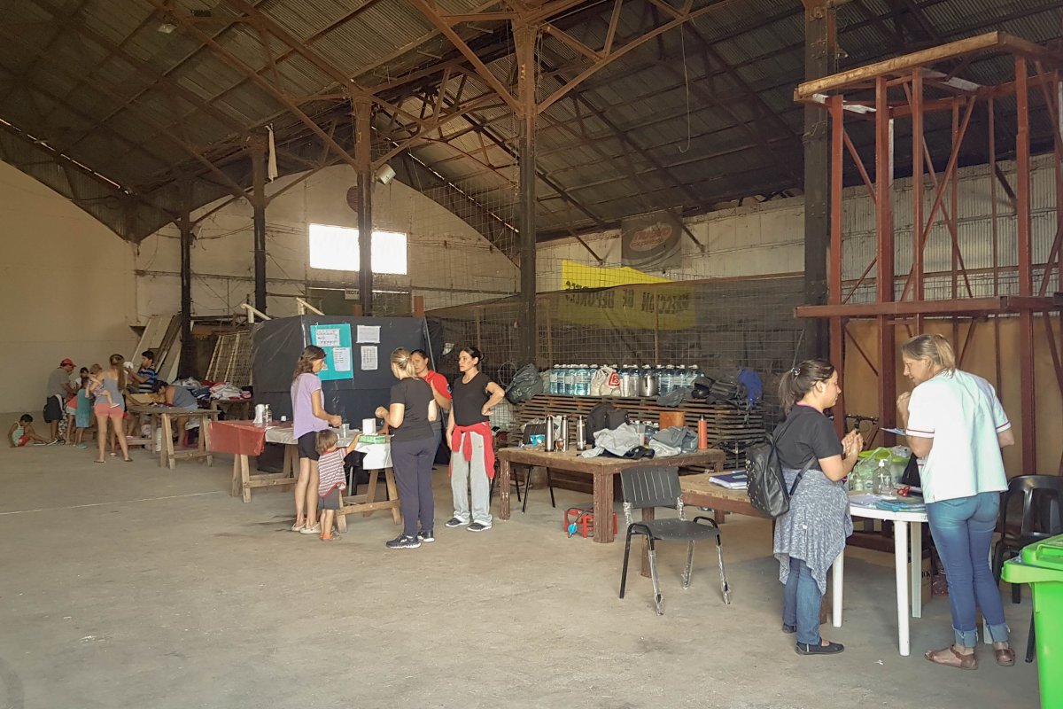 El operativo y asistencia en el centro de evacuados montado en los Galpones del Puerto supuso la organización centralizada y en este sentido Néstor Pintos explicó que “se utilizó la nave 3 como centro de recepción de donaciones de ropa, colchones y frazadas, que eran seleccionadas, ordenadas y entregadas a los damnificados según su demanda, coordinado por los Scouts de la ciudad de Gualeguaychú” y continuó “en esta nave estaba dispuesto también el centro de coordinación general y el centro de datos desde donde se planificaban y coordinaban todas las acciones junto con la recepción, elaboración e información de todos los datos pertinentes al operativo. La luminaria del lugar estuvo a cargo de Electrotecnia y también se dispuso un sector de enfermería, de cocina donde se recibía y almacenaban las donaciones de alimentos, agua y diversos desinfectantes, y donde se realizaban el desayuno y se repartía el almuerzo y la cena. Además se contaba con un espacio de recreación con actividades para los niños y jóvenes”.