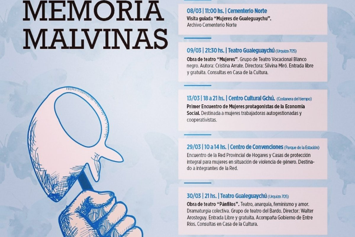 En este sentido, la Municipalidad de Gualeguaychú junto a instituciones educativas y organizaciones sociales lleva adelante la agenda "Mujeres, Memoria, Malvinas", con actividades educativas, conmemorativas, muestras, obras de teatro, entre otras.