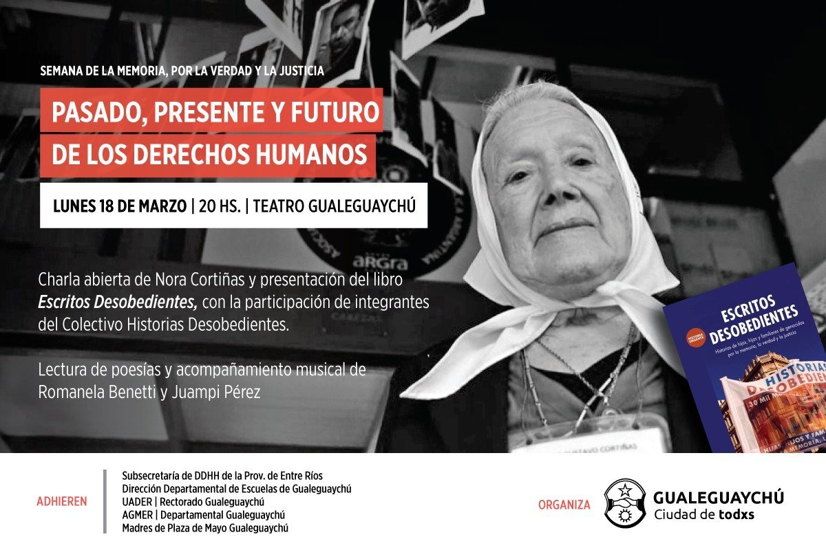 En el marco de la agenda "Mujeres, Memoria, Malvinas" que la Municipalidad junto a instituciones locales llevan adelante, Nora Cortiñas, una de las referentes de la lucha por los derechos humanos, visitará Gualeguaychú para participar de la presentación del libro Escritos desobedientes.