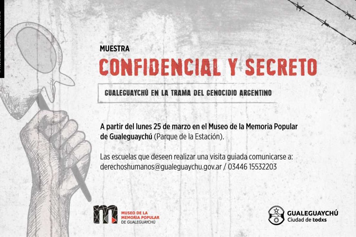 En el marco de la agenda de actividades Mujeres, Memoria y Malvinas, impulsada por la Municipalidad, el lunes 25 de marzo en el Parque de la Estación se inaugura la muestra "Confidencial y secreto: Gualeguaychú en la trama del genocidio argentino". Se trata de una propuesta que pretende promover la reflexión sobre la profunda transformación social que implicó, en nuestra sociedad, el proceso genocida llevado adelante por la última dictadura militar (1976 – 1983).